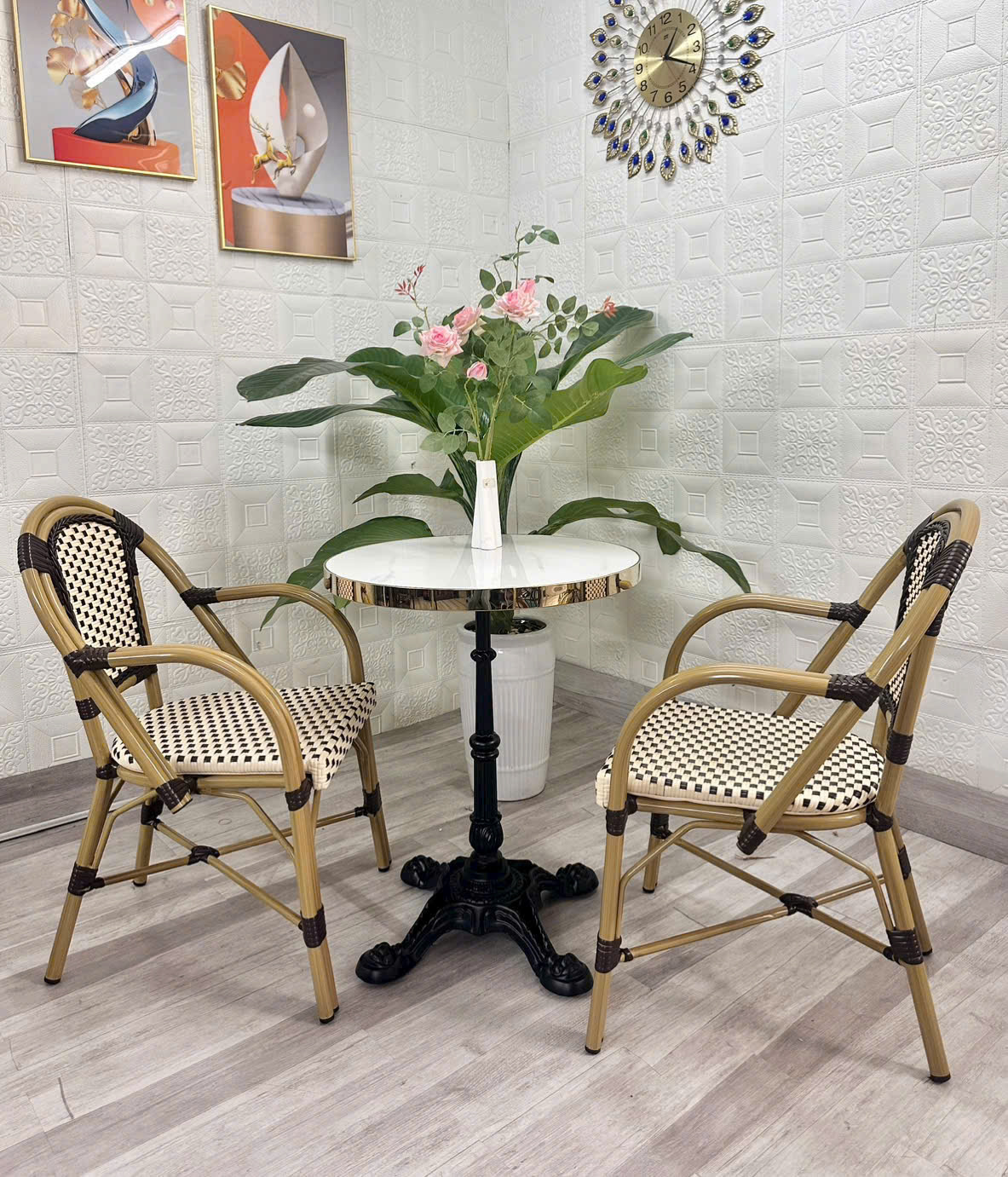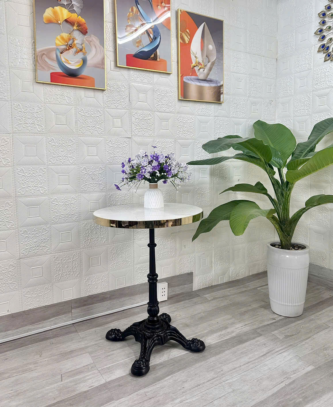 Chân bàn bằng hợp kim nhôm, mặt bàn là đá phiến ceramic, KT: 60 X 73CM, thiết kế mềm mại tạo nên vẻ thanh lịch, sang trọng. Phù hợp cho mọi điều kiện thời tiết.