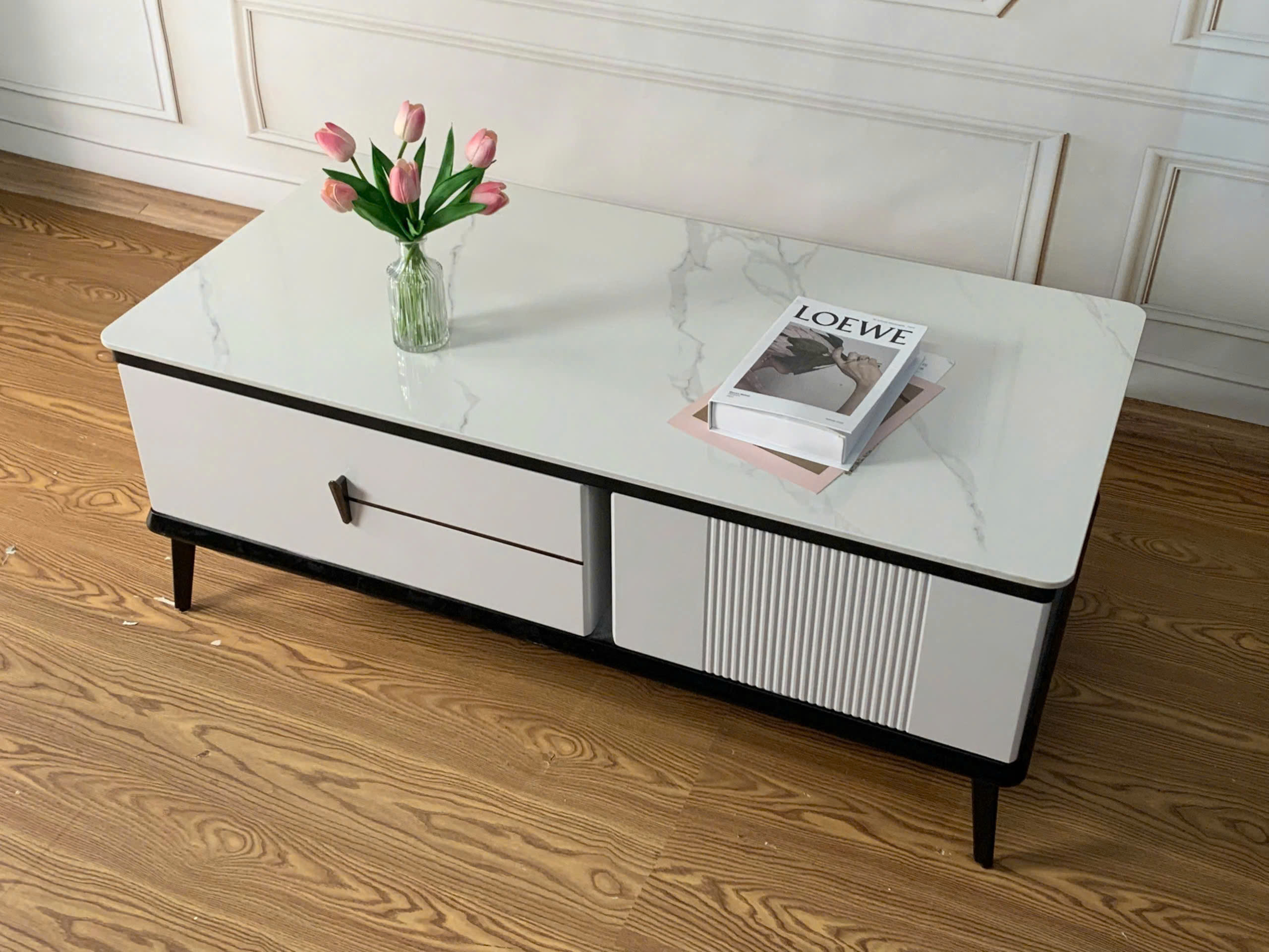 - Bàn trà nhập khẩu, mặt bàn bằng ĐÁ Ceramic cao cấp, chân bằng thép không rỉ, gồm 2 ngăn kéo gỗ sơn cao cấp