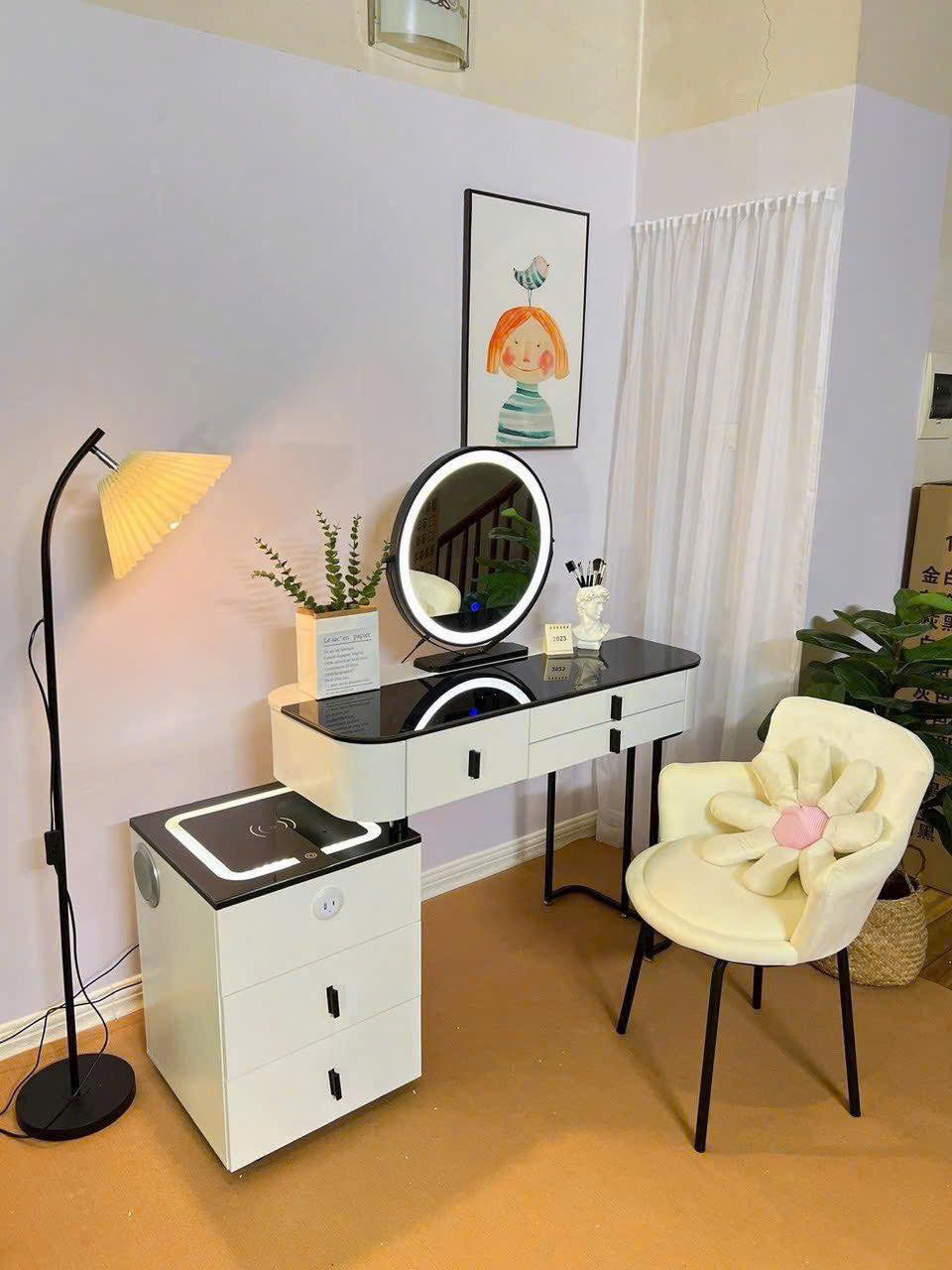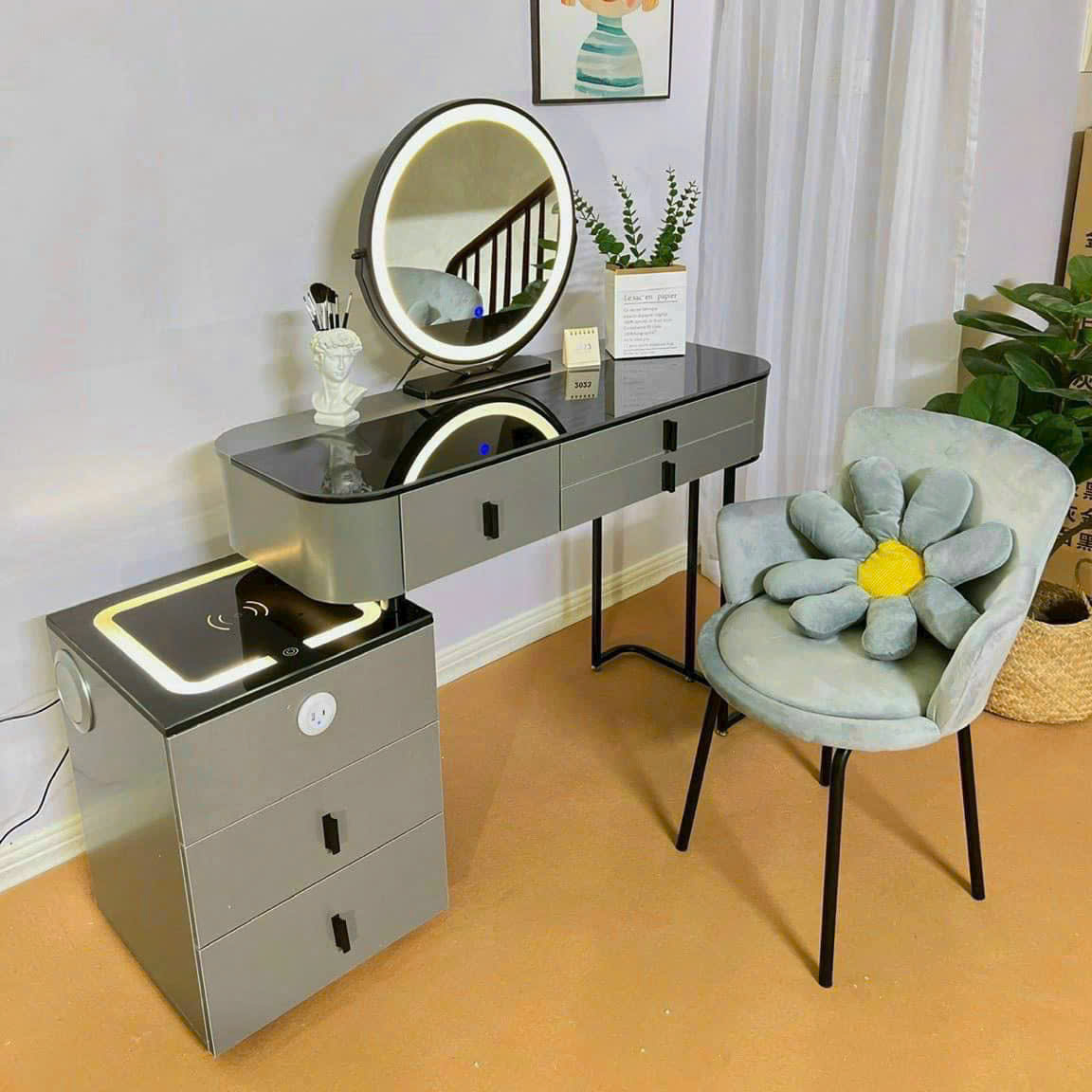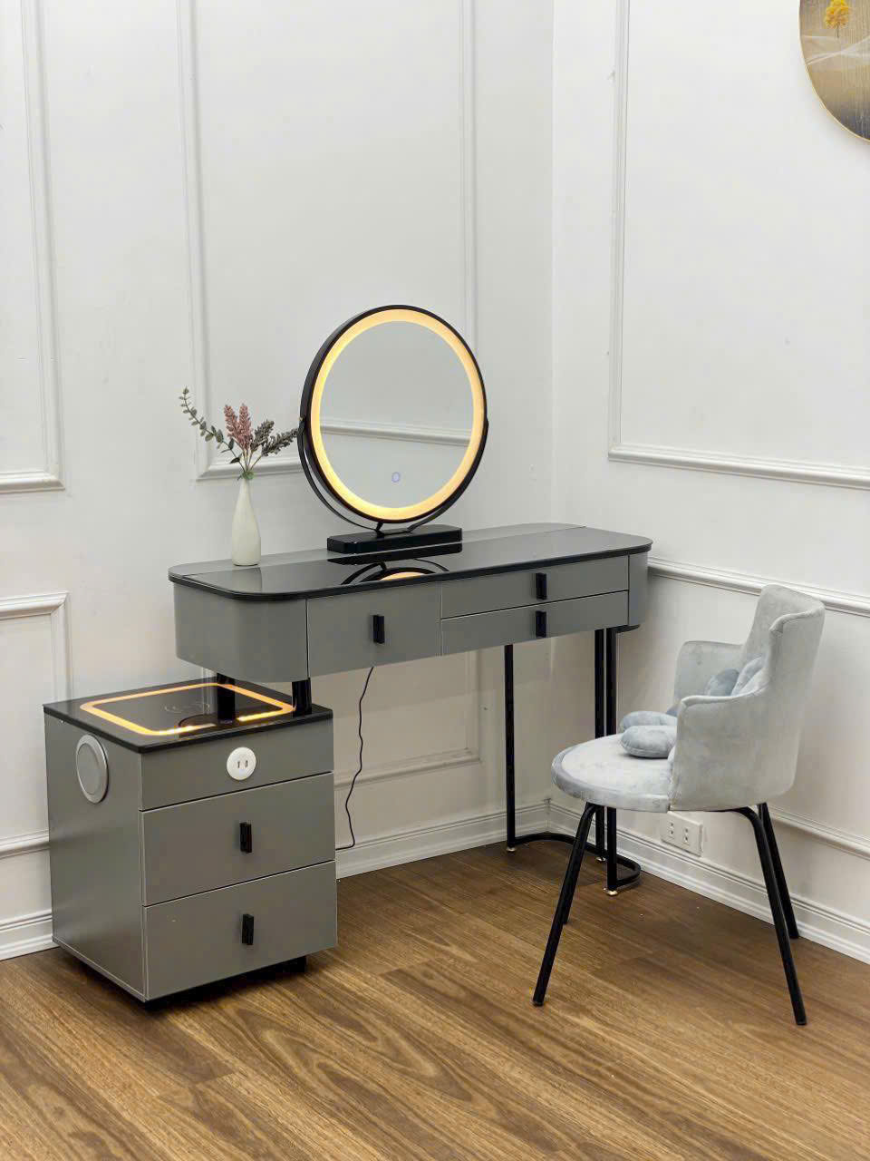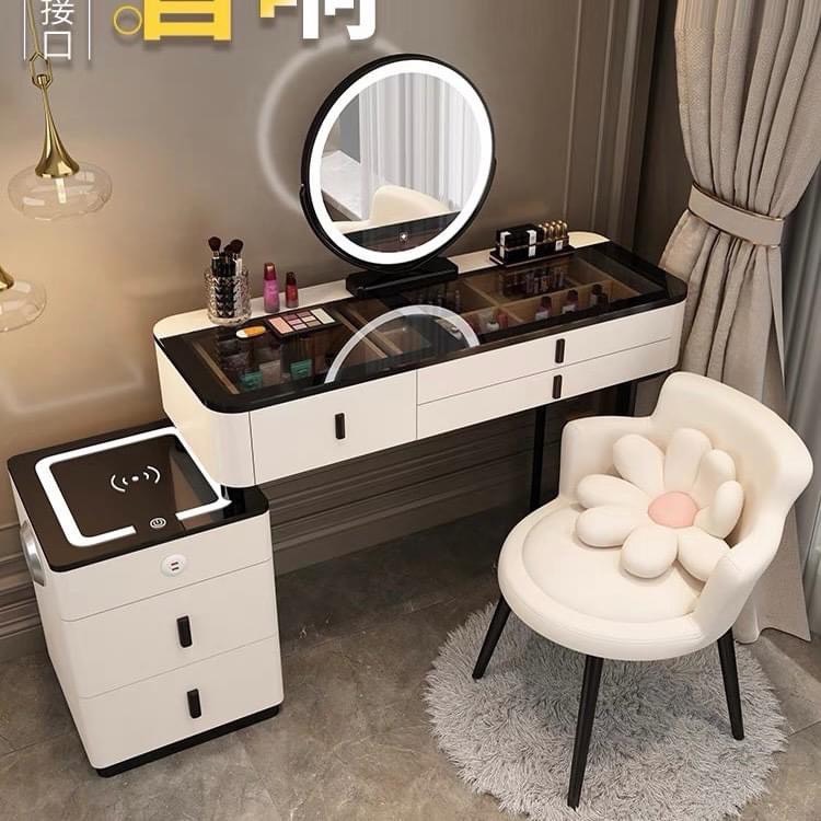 Bàn trang điểm , bàn phấn thông minh có sạc không dây kèm gương đèn Led 3 màu và táp đầu giường vuông phong cách Bắc Âu sang trọng , kích thước 100cm