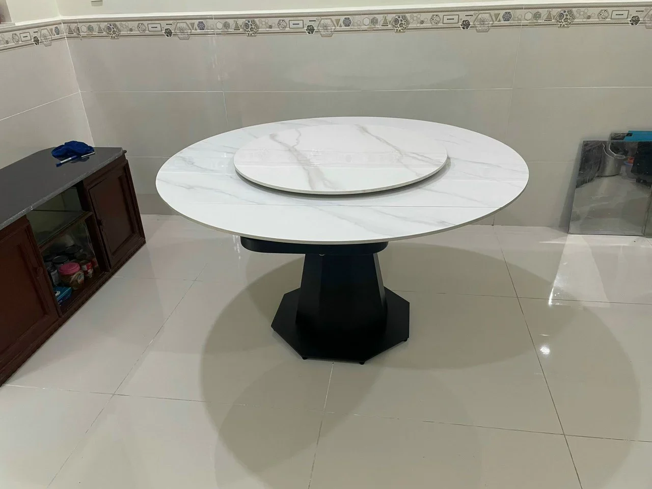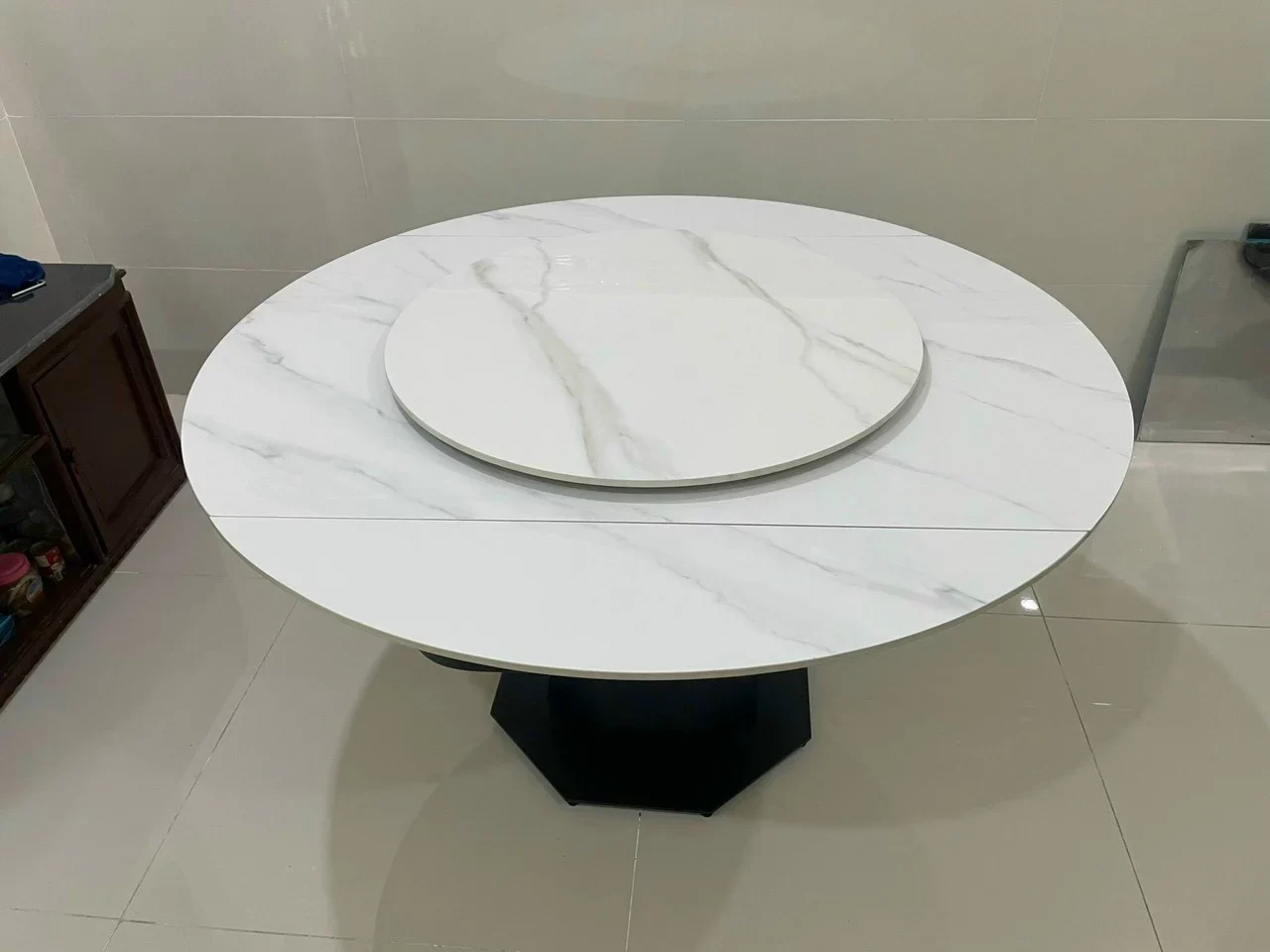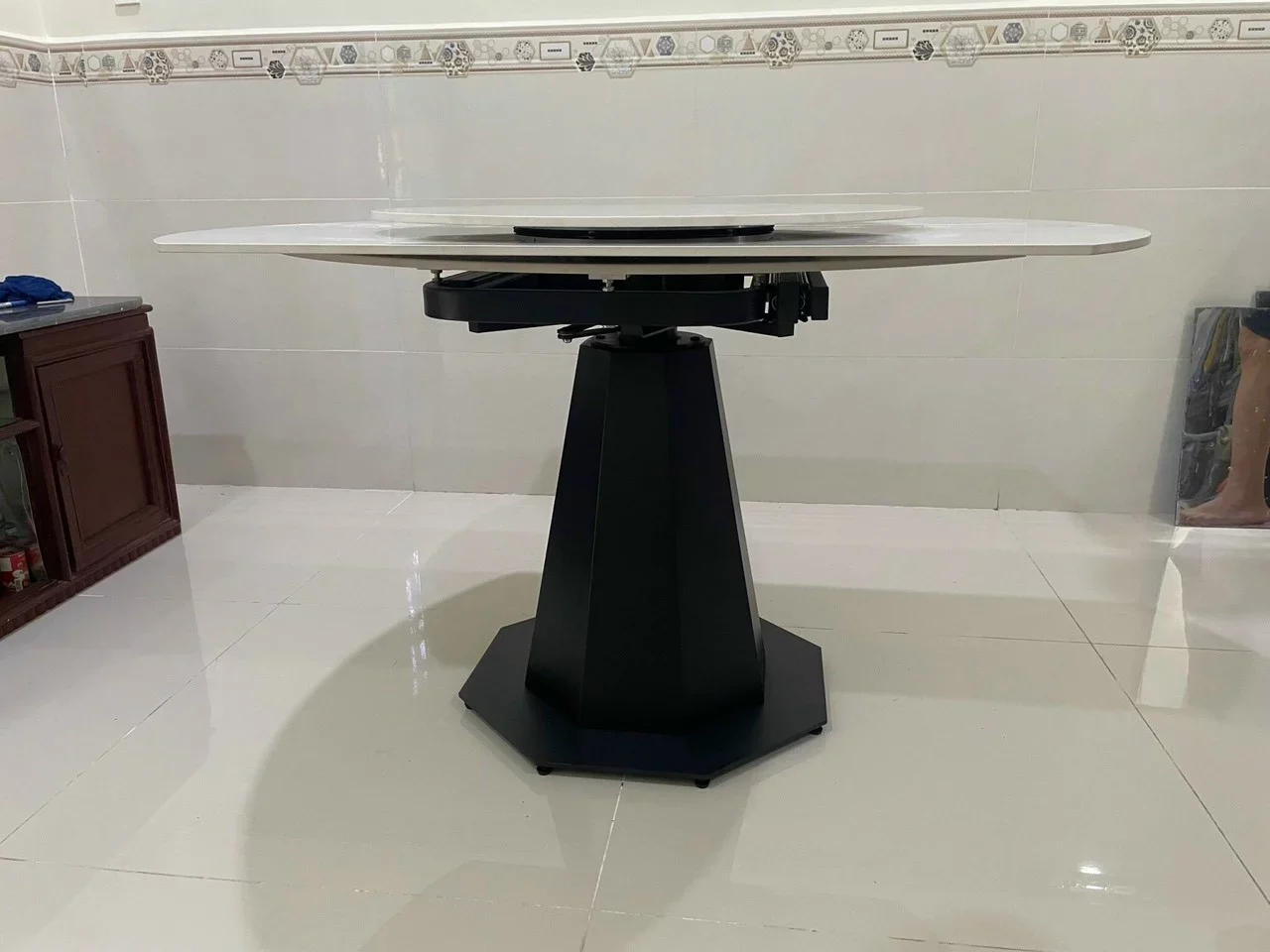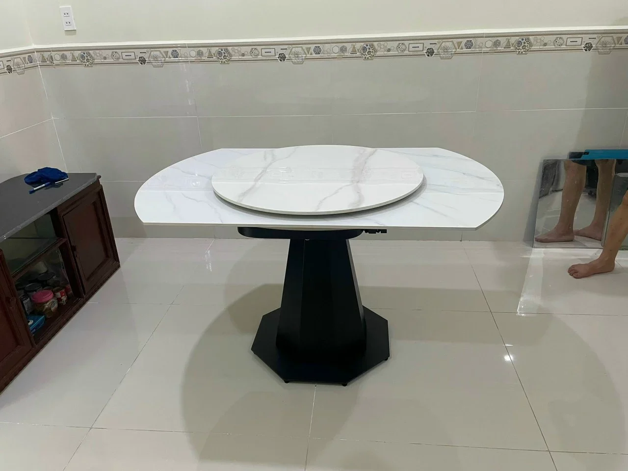 - Bàn có thể tuỳ biến từ bàn tròn thành chữ nhật giúp mở rộng diện tích sử dụng, chất liệu đá cẩm thạch trơn bóng gia công cho bàn dễ dàng vệ sinh lau chùi các vết bụi bẩn, thức ăn, có khả năng chống ẩm mốc tốt, chất liệu hoàn toàn thân thiện với sức khoẻ người sử dụng.
