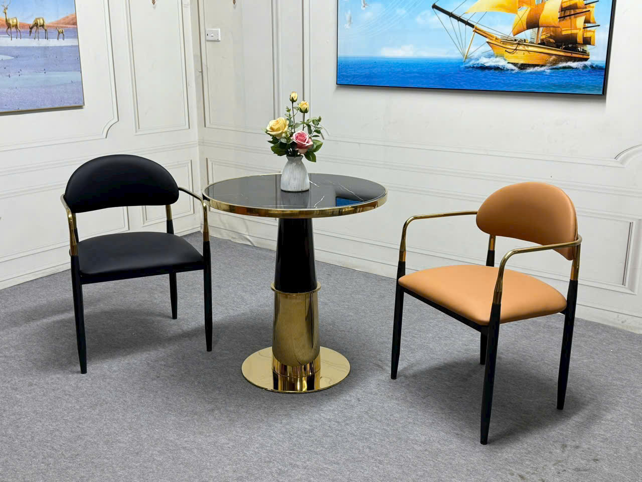 – Chất liệu: mặt đá ceramic cao cấp, chân sắt sơn tĩnh điện, đế inox mạ vàng - GHẾ: