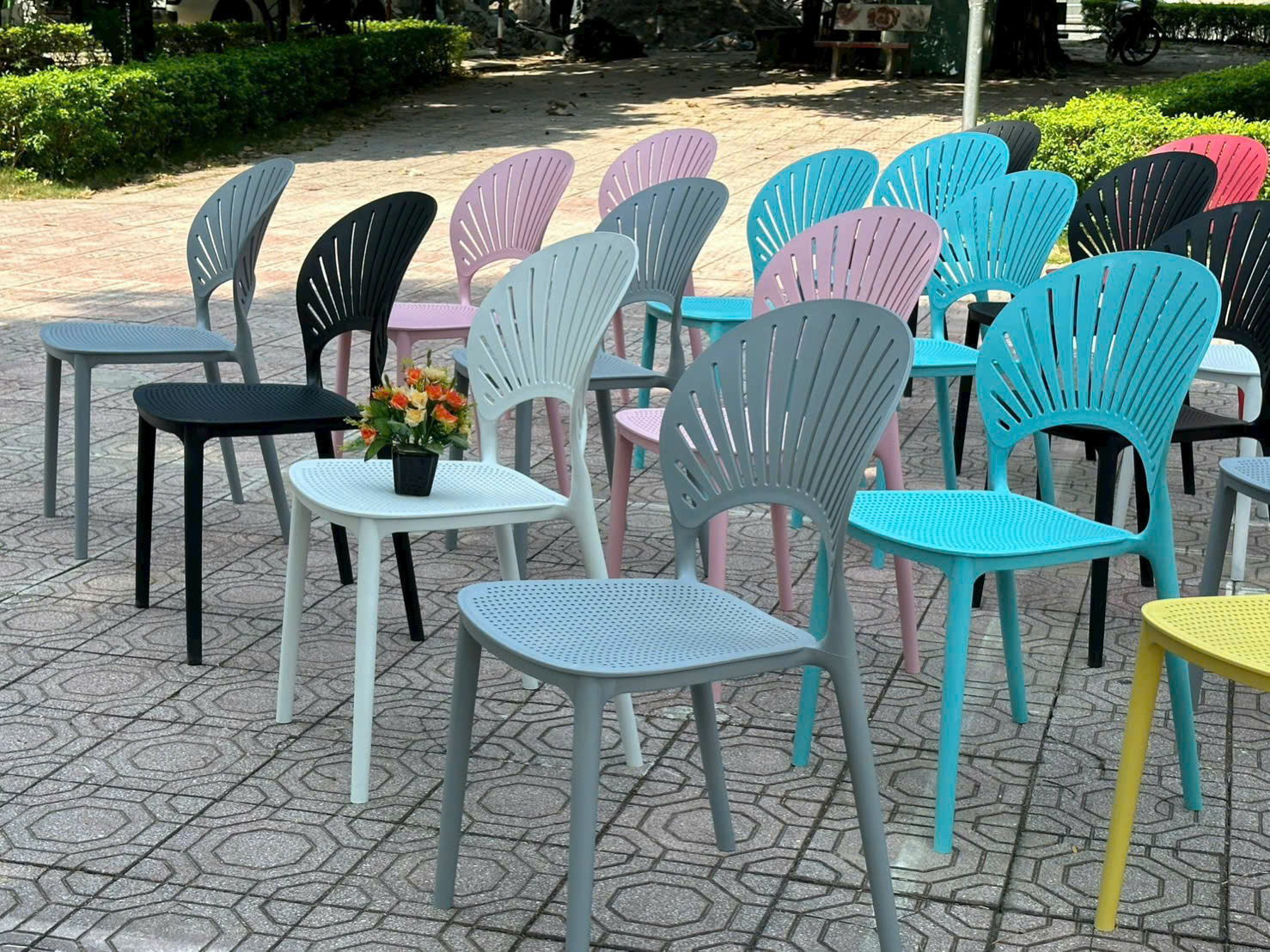 - Chất liệu ghế: Mặt nhựa đúc, chân nhựa.