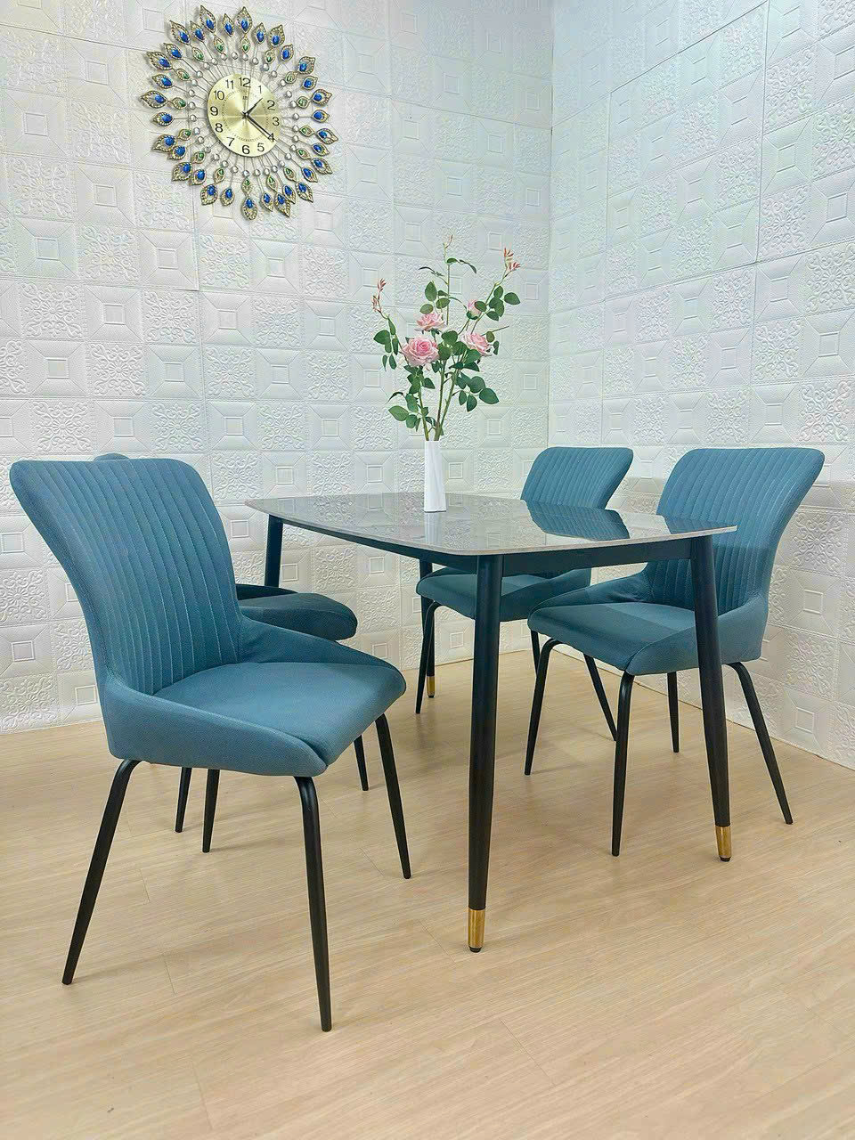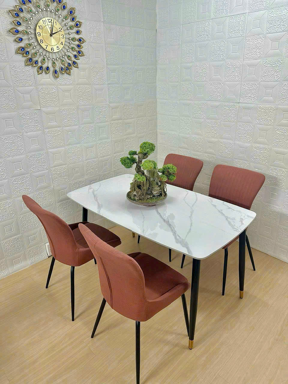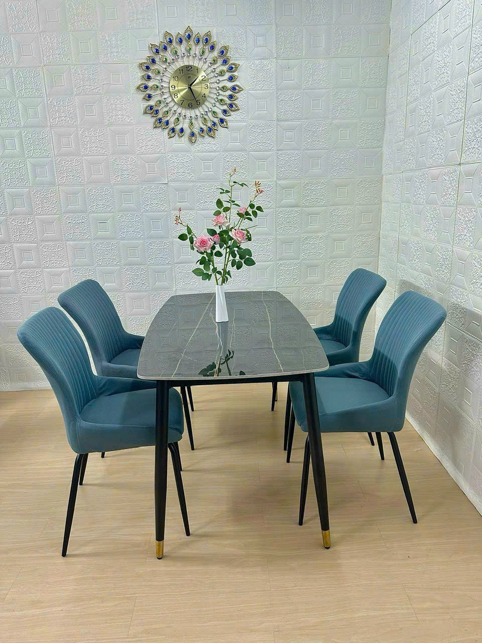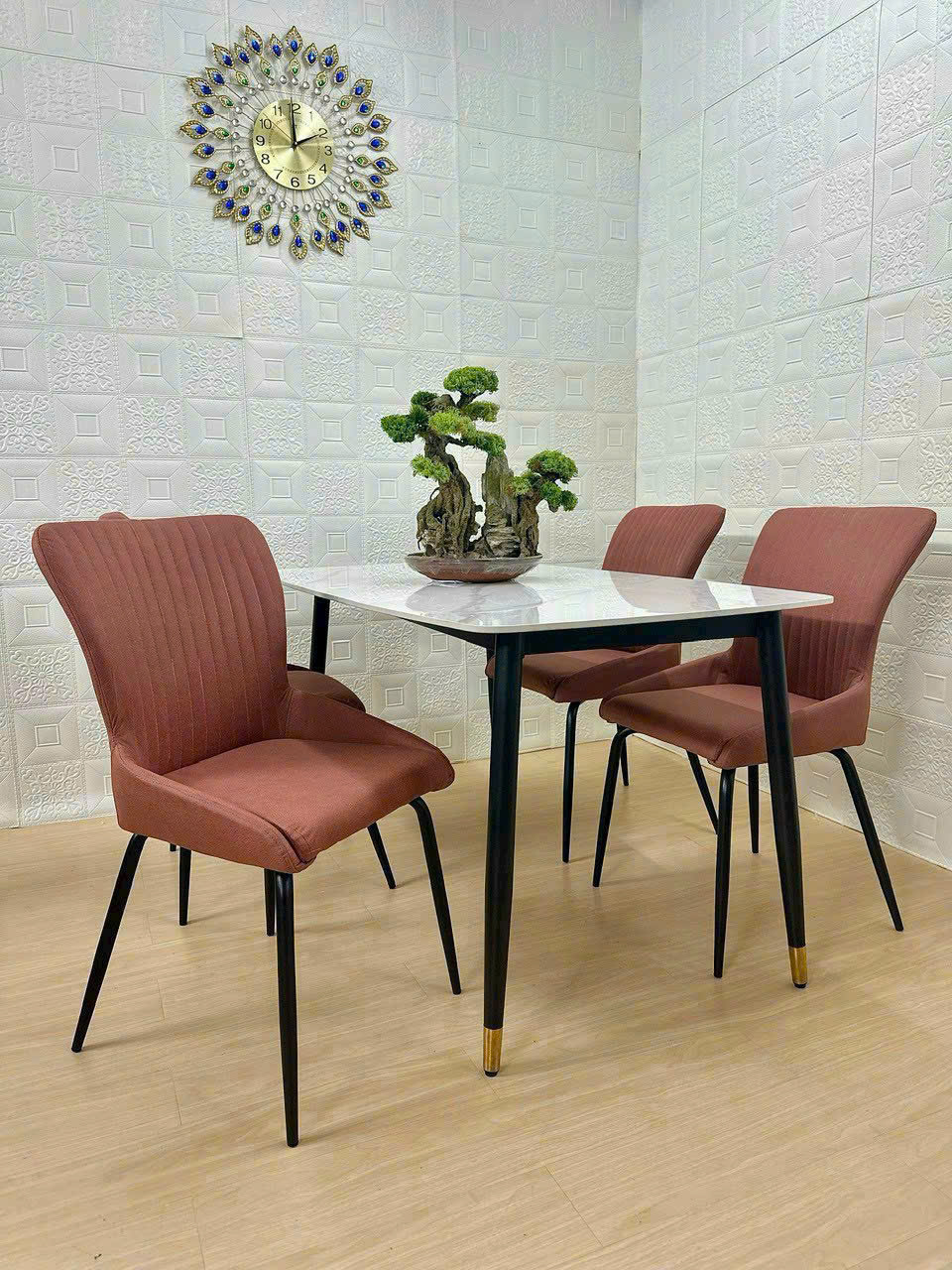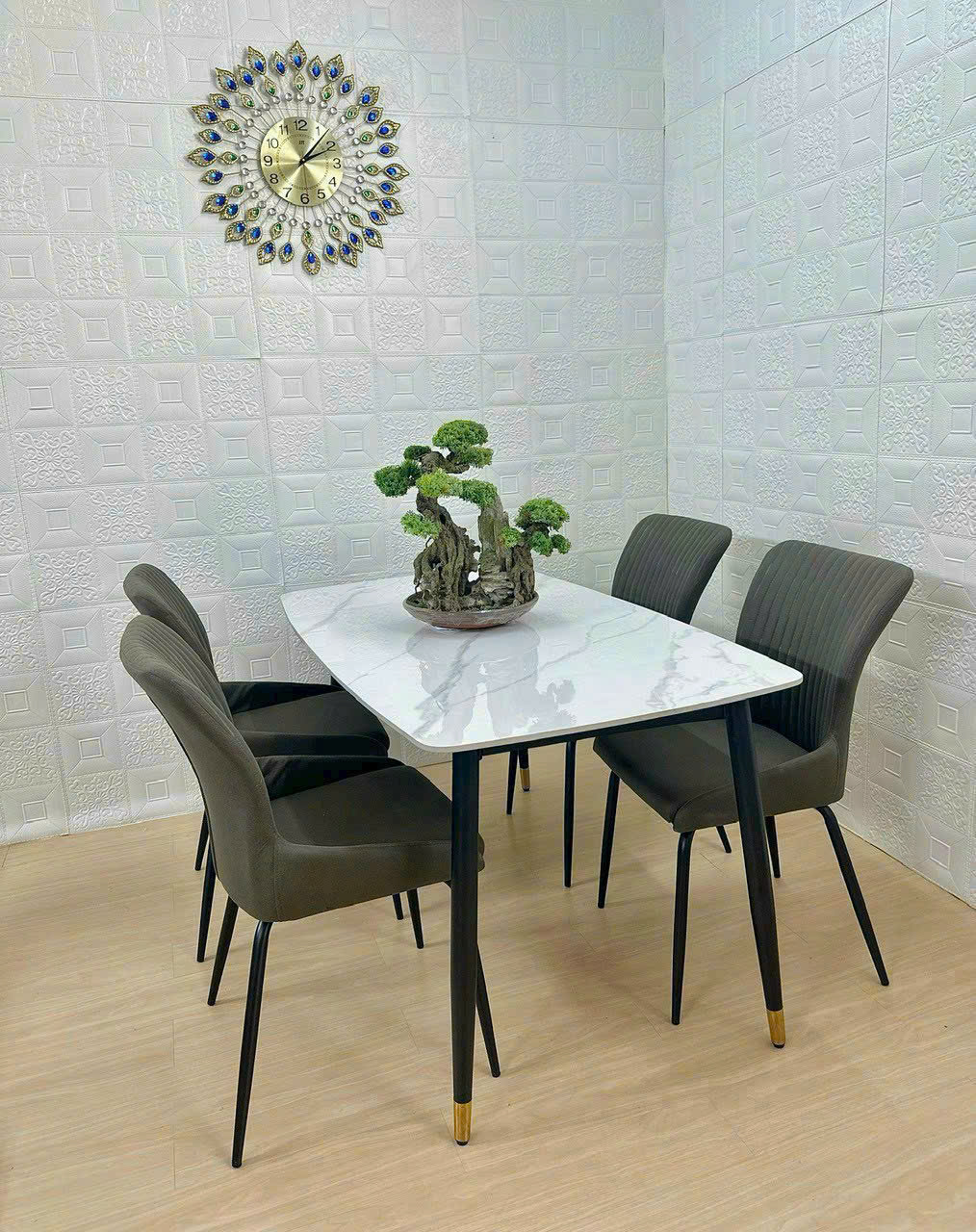 - Vật liệu: Mặt bàn bằng đá Ceramic cao cấp, chân bằng thép sơn tĩnh điện. Ghế được bọc nệm vải da cao cấp và chân thép sơn tĩnh điện.