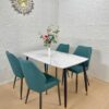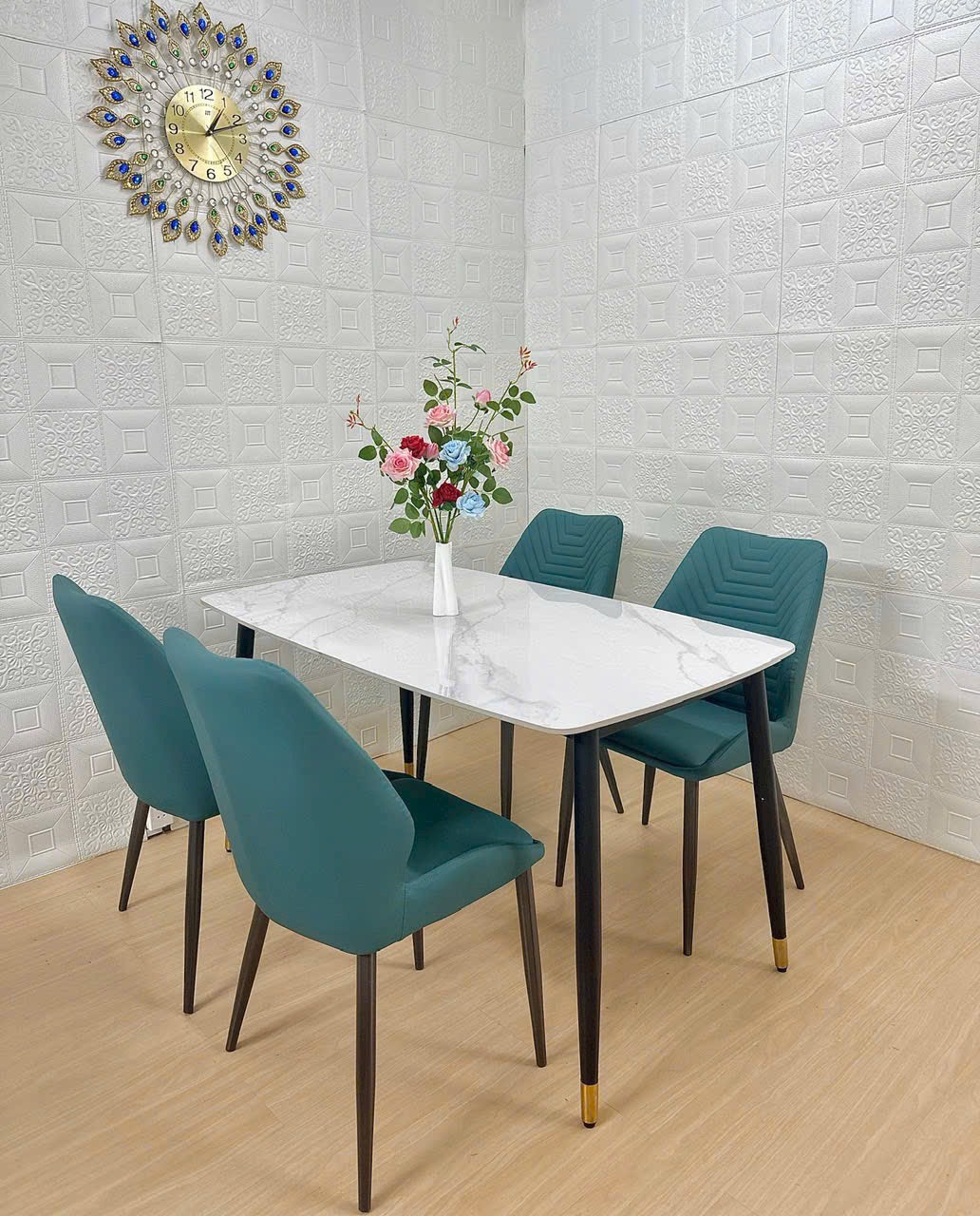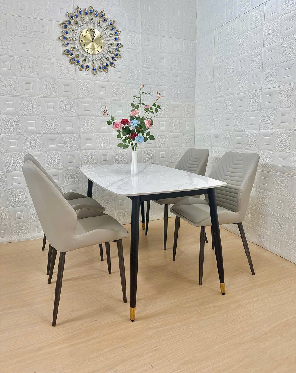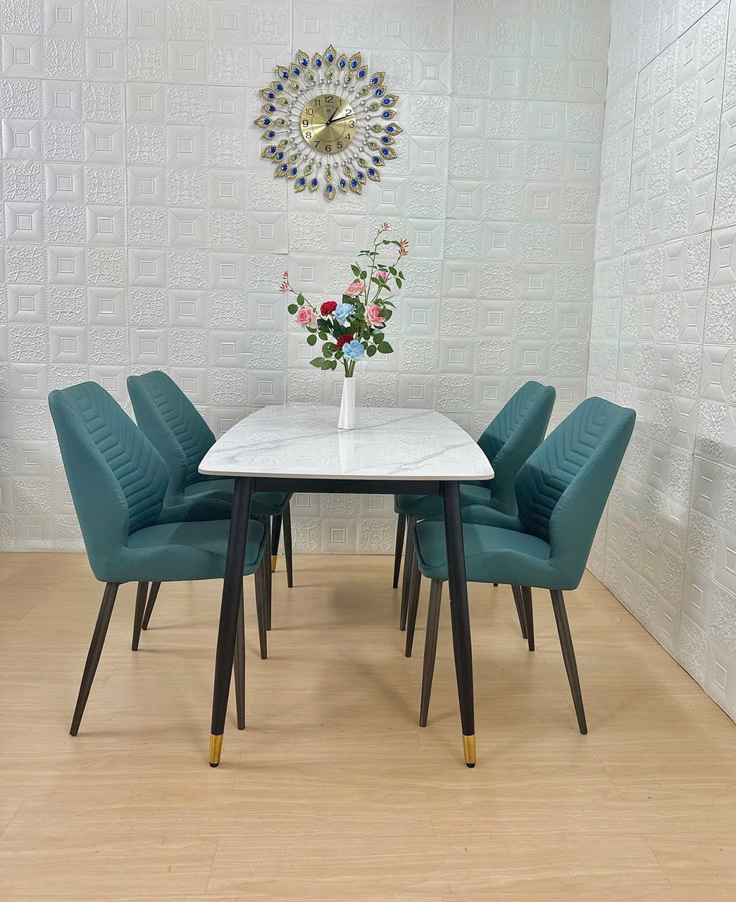- Vật liệu: Mặt bàn bằng đá Ceramic cao cấp, chân bằng thép sơn tĩnh điện. Ghế được bọc nệm vải da cao cấp và chân thép sơn tĩnh điện.