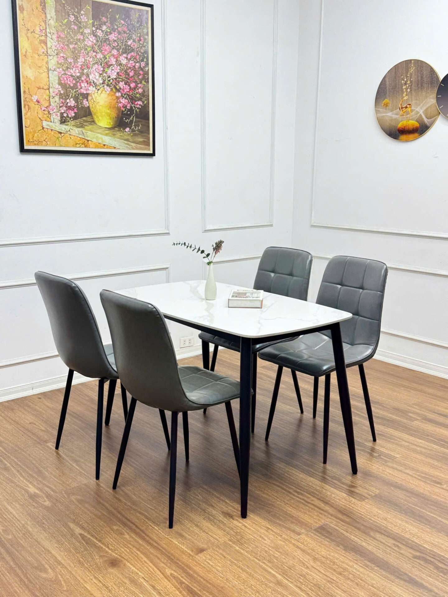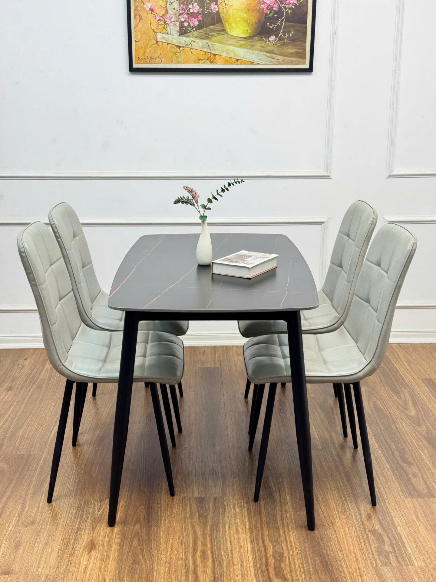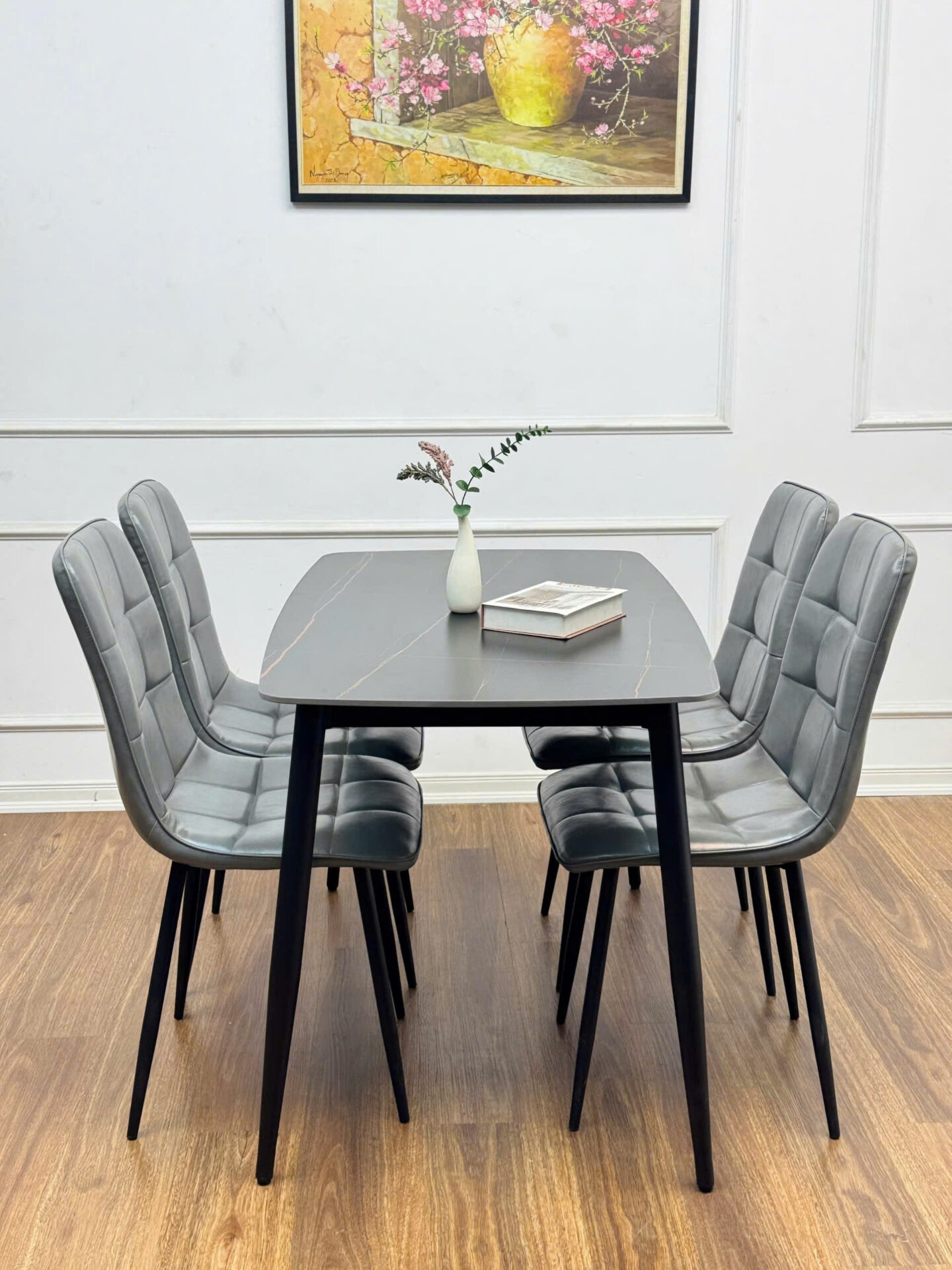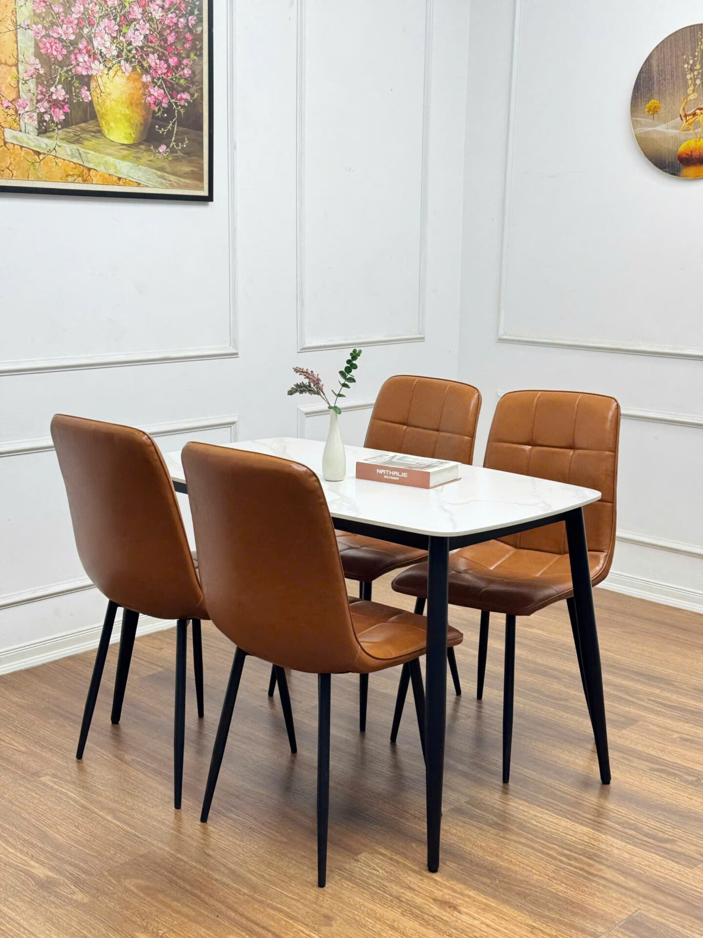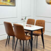 - Vật liệu: Mặt bàn bằng đá Ceramic cao cấp, chân bằng thép sơn tĩnh điện. Ghế được bọc nệm da cao cấp và chân thép sơn tĩnh điện.