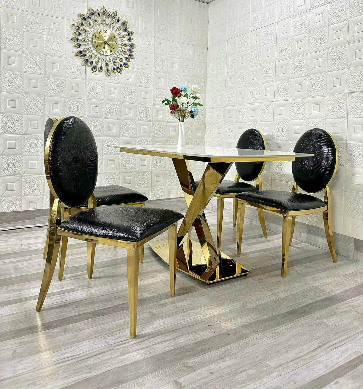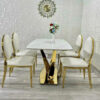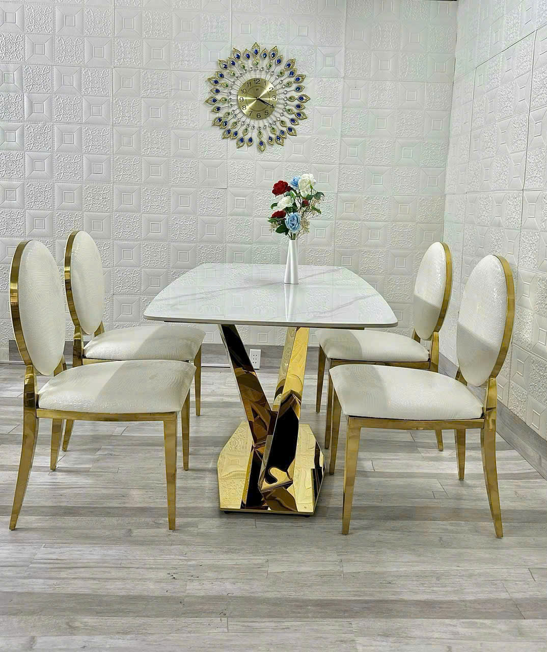 - Vật liệu: Mặt bàn bằng đá cao cấp, chân INOX MẠ VÀNG. Ghế được bọc nệm da cao cấp và CHÂN INOX MẠ VÀNG