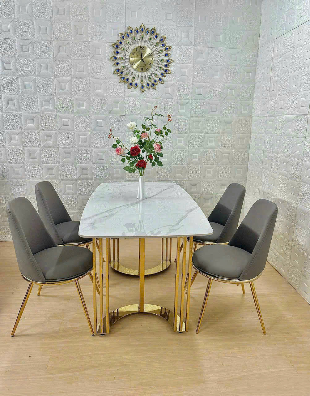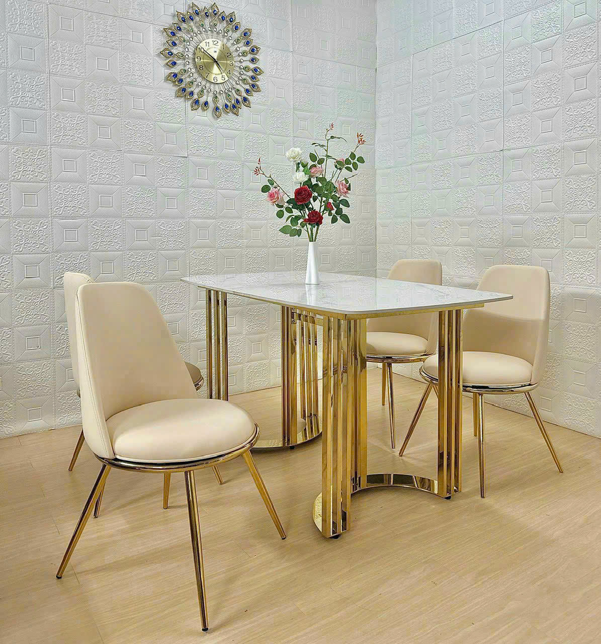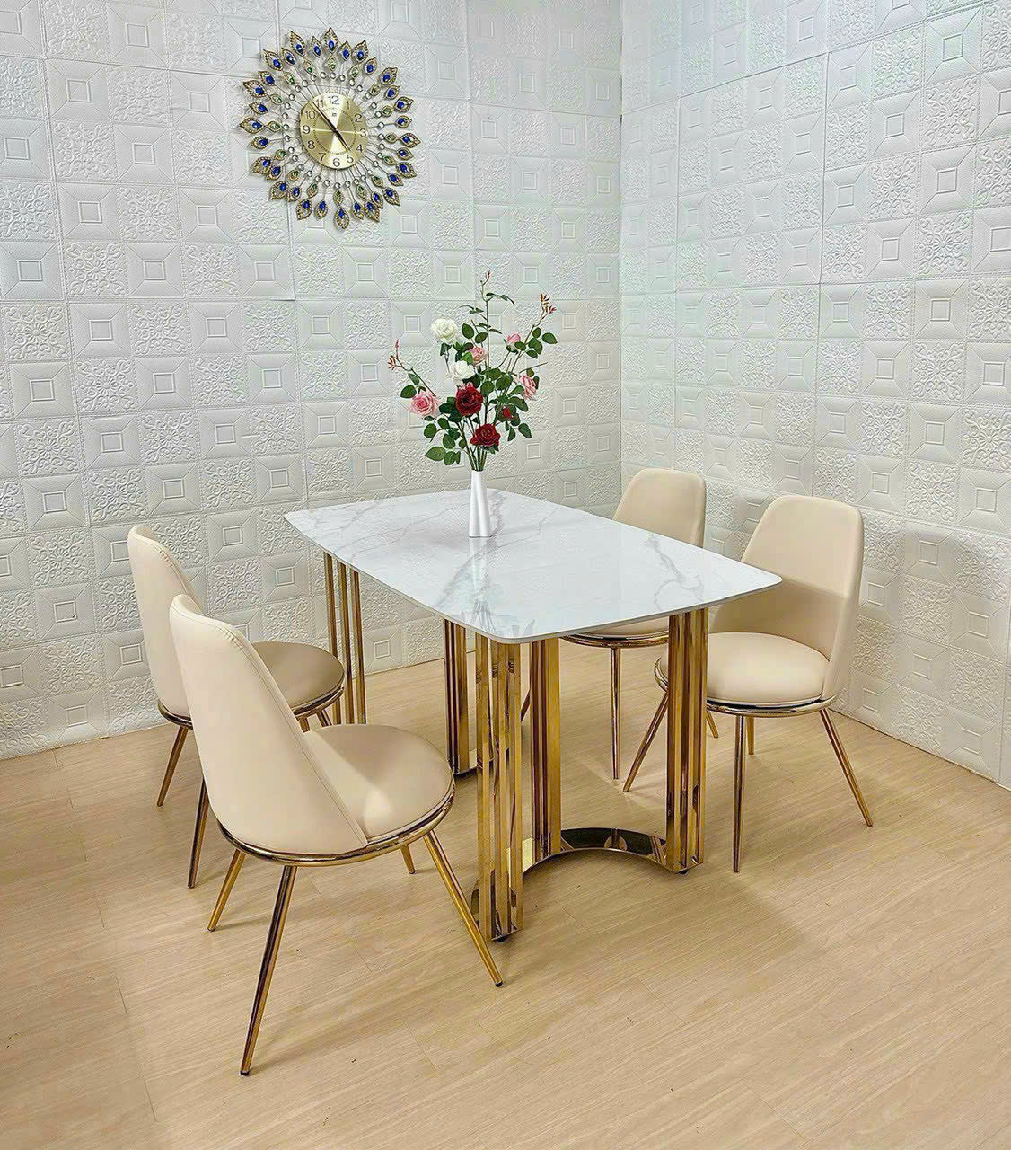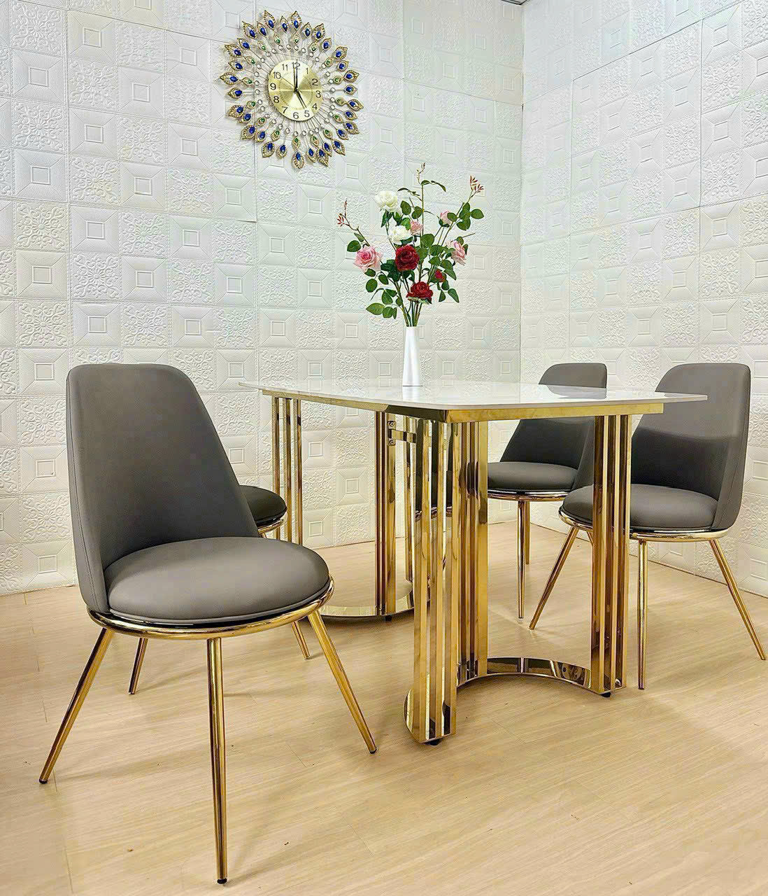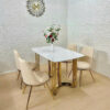 - Vật liệu: Mặt bàn bằng đá cao cấp, chân INOX MẠ VÀNG. Ghế được bọc nệm da cao cấp và CHÂN SẮT MẠ VÀNG