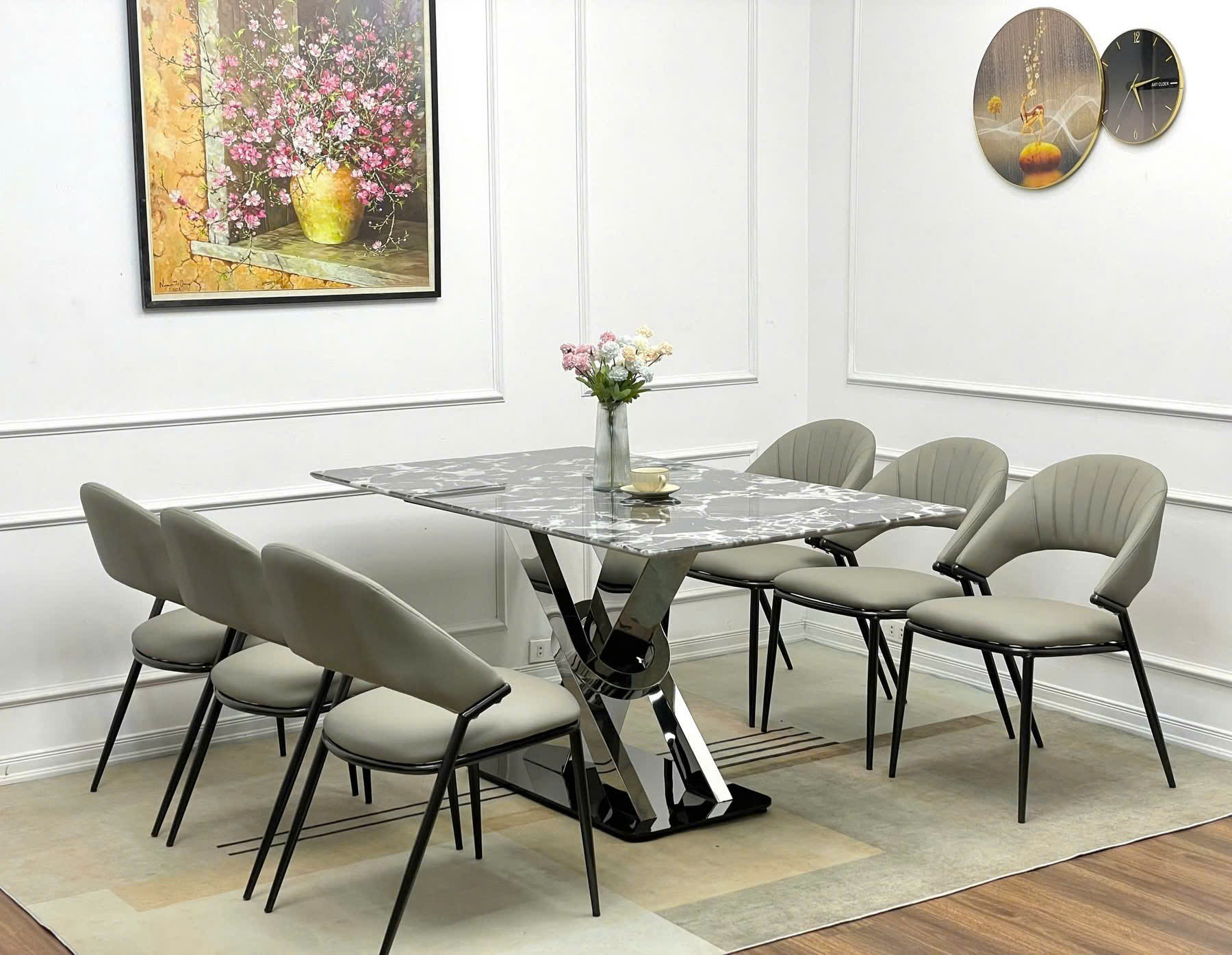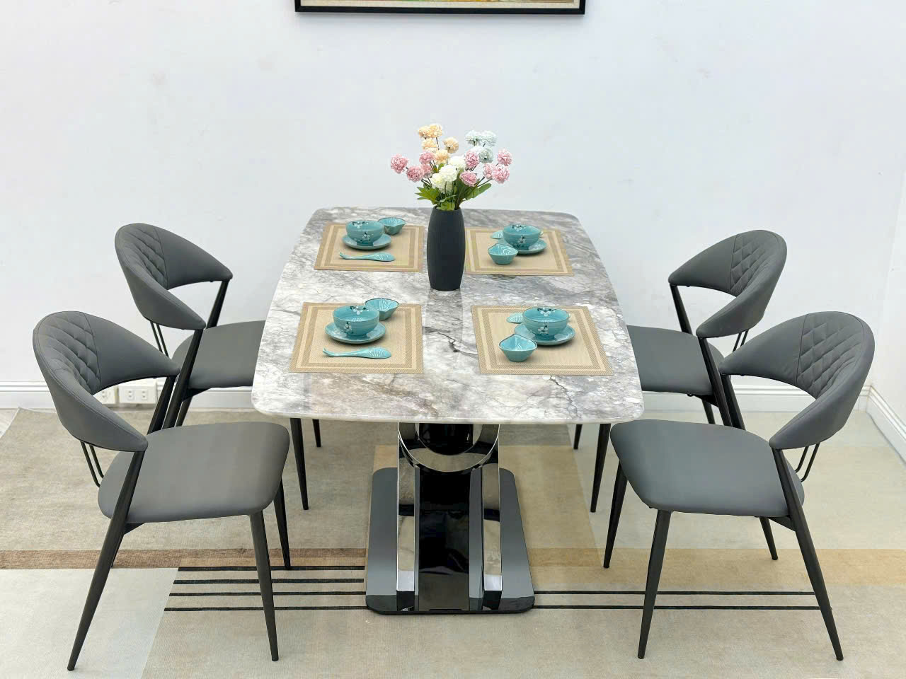 Bộ bàn ăn nhập khẩu mặt đá – mã VN-AK1965 Thiết kế sang trọng, thanh lịch cùng vật liệu cao cấp, bền bỉ, có khả năng chống trầy xước, han gỉ, bong tróc,….hiệu quả. Sản phẩm là lựa chọn lý tưởng cho nhiều không gian nội thất khác nhau như phòng ăn gia đình, bàn ghế quán ăn, quán cafe, bàn ghế tiếp khách văn phòng, công ty,….