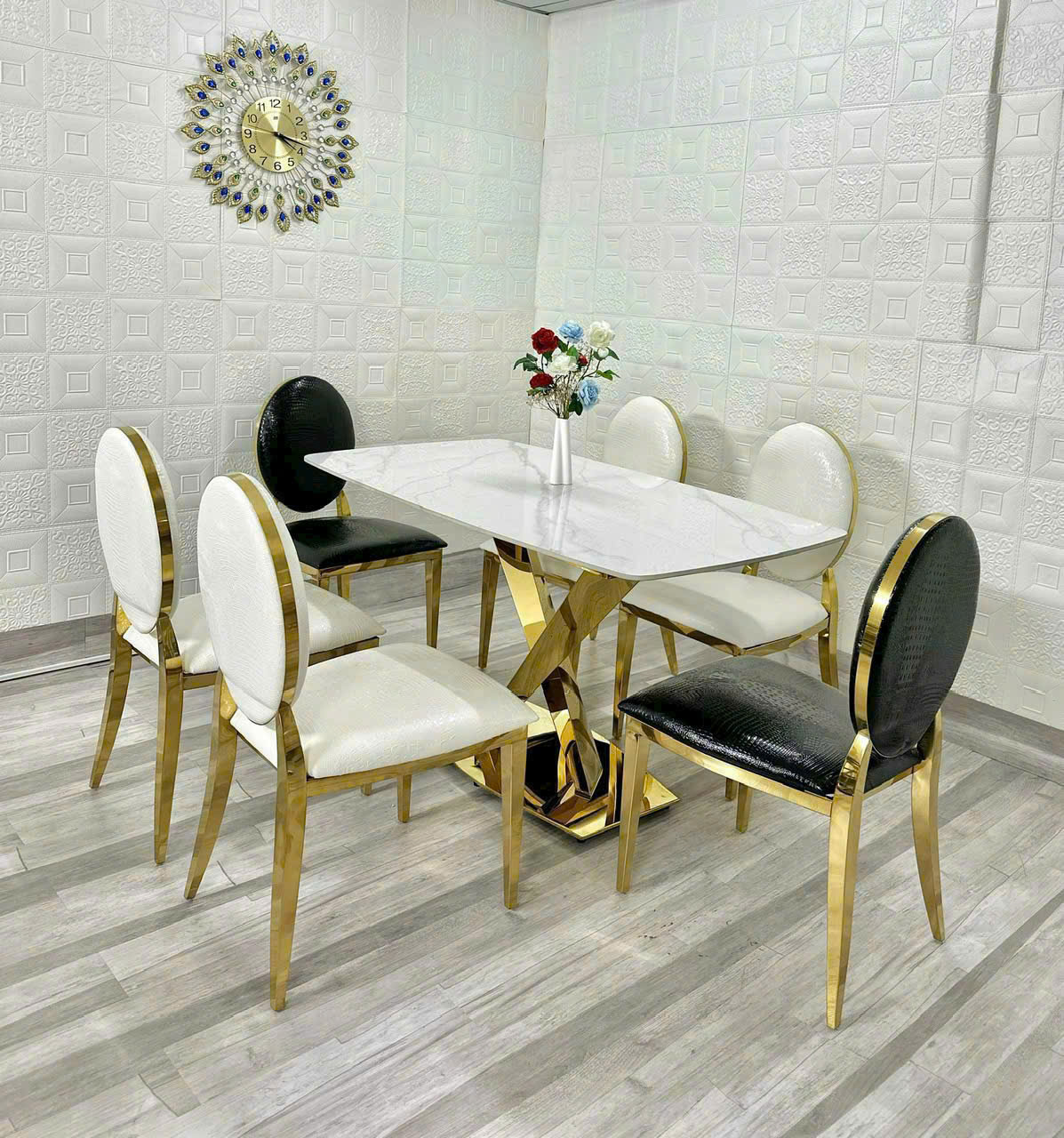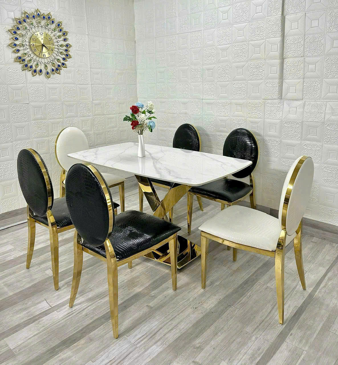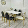 - Vật liệu: Mặt bàn bằng đá cao cấp, chân INOX MẠ VÀNG. Ghế được bọc nệm da cao cấp và CHÂN INOX MẠ VÀNG