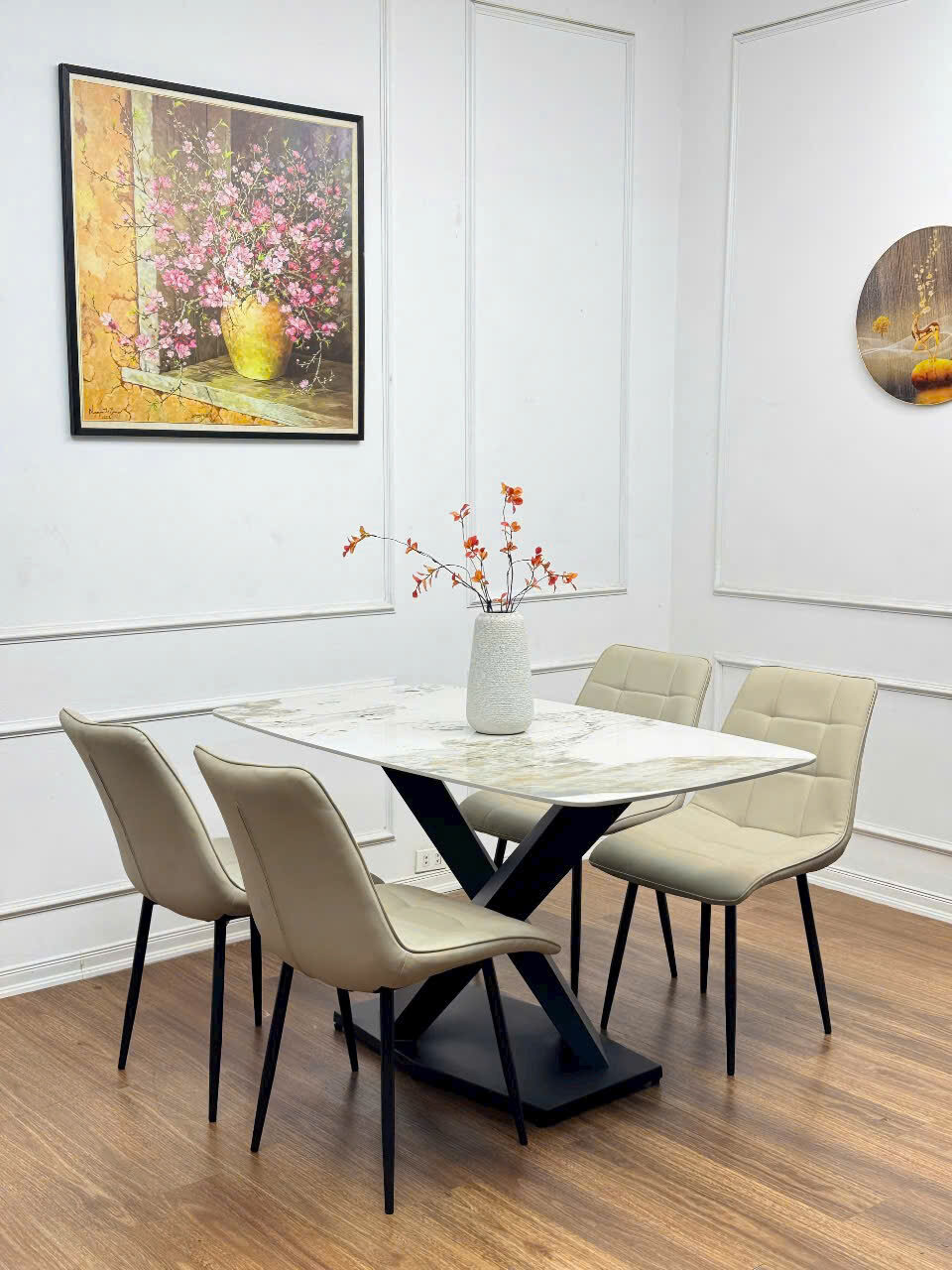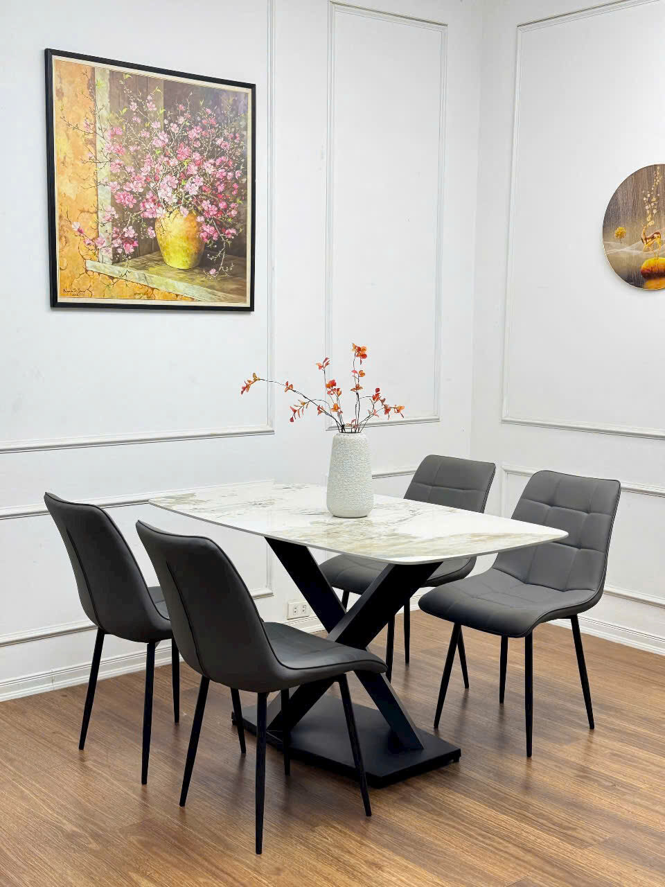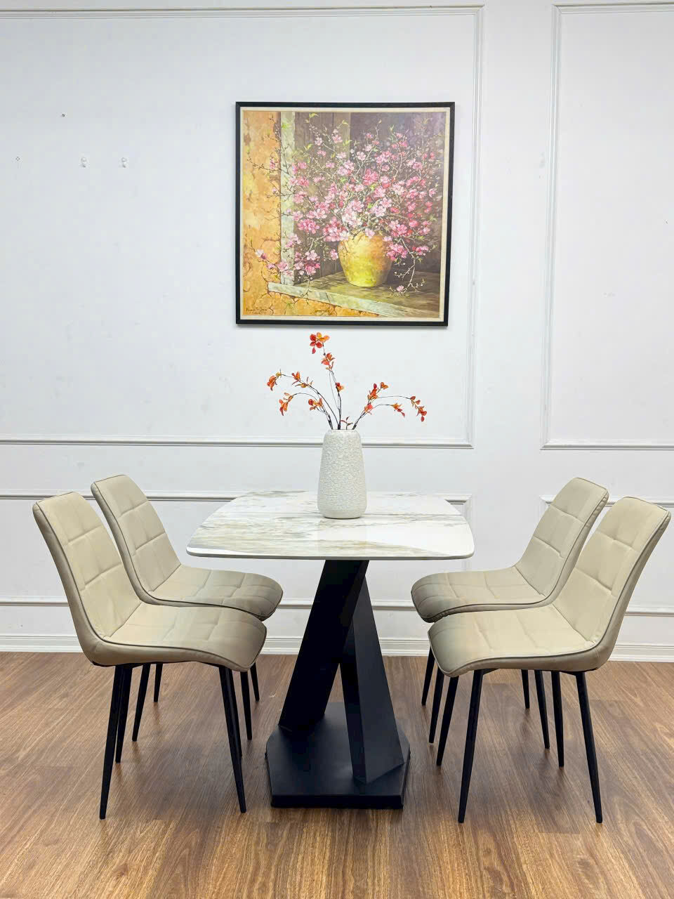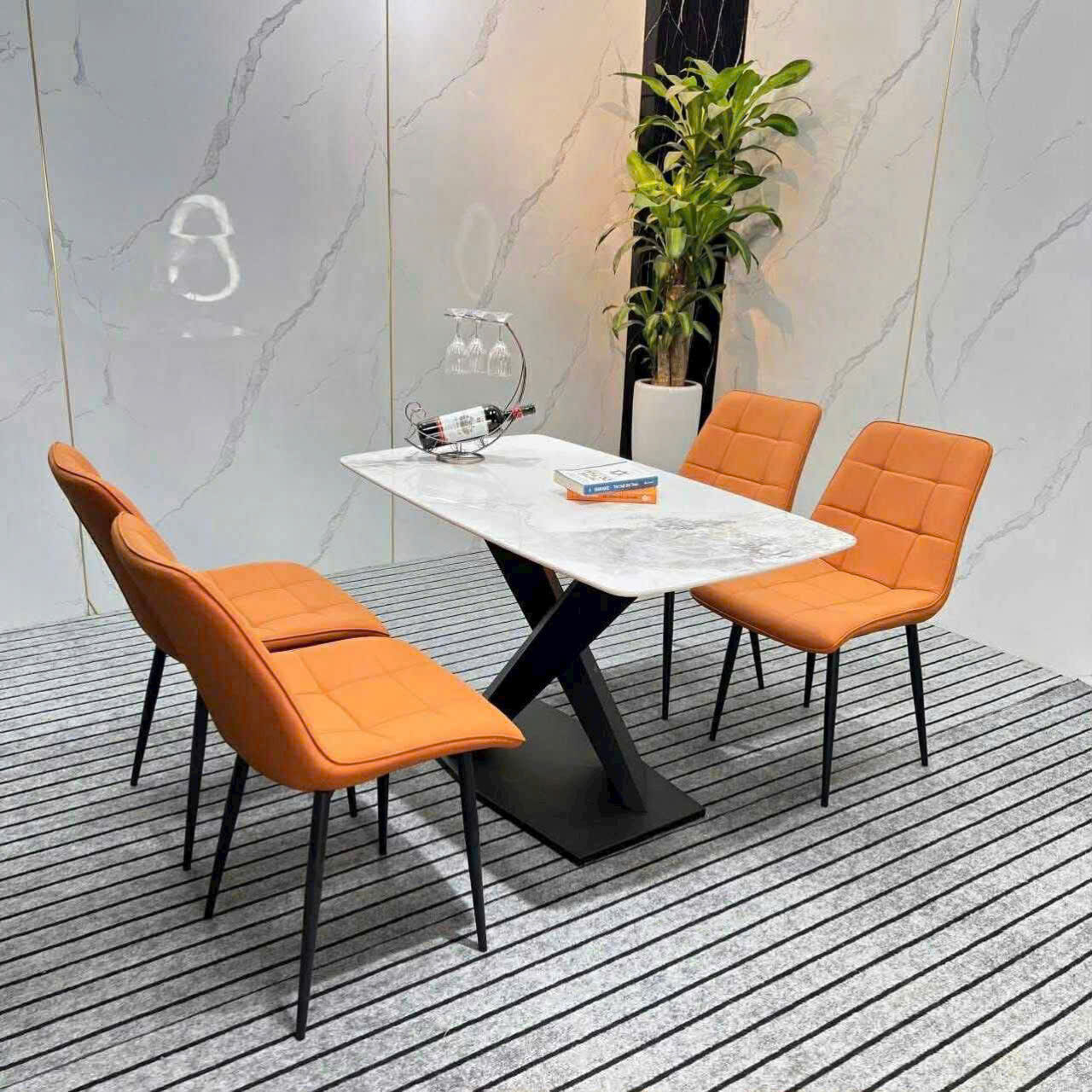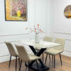 Bộ Bàn Ăn Mặt Đá 4 Ghế Nhập Khẩu, thích hợp không gian chung cư hoặc diện vừa phải và nhỏ. Nổi bật là bàn ăn mặt đá ceramic sáng bóng, sang trọng, khung chân bàn thép chắc chắn, đẹp mắt. Bộ bàn ghế mang phong cách hiện đại phù hợp nhất với không gian chung cư và những người thích sự trẻ trung.