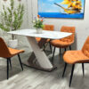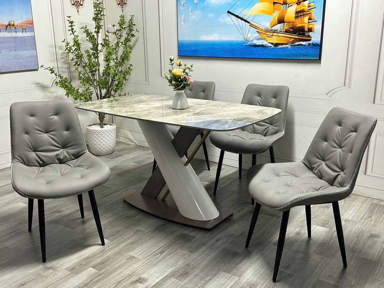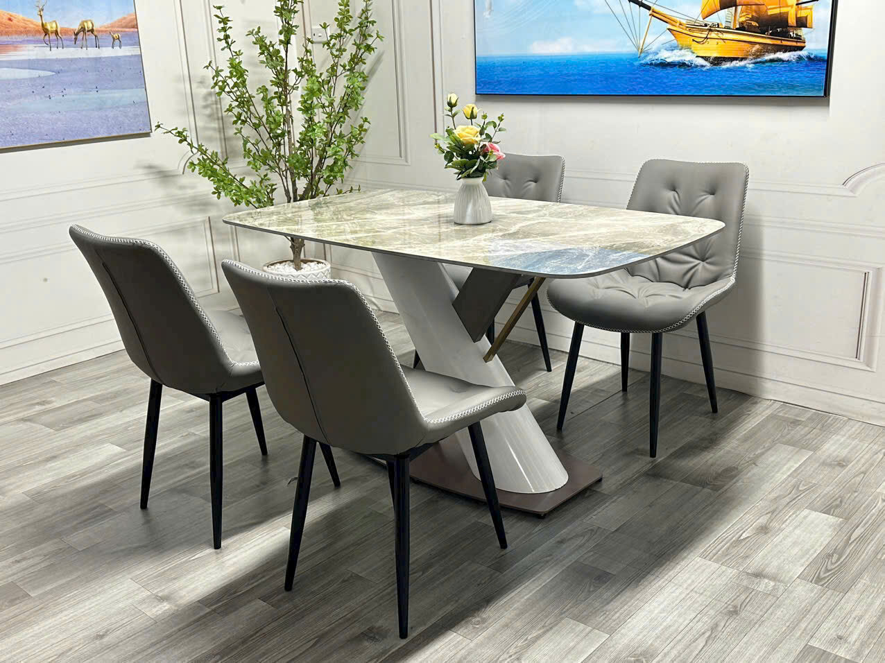 Nếu bạn đang tìm kiếm một bộ bàn ăn hiện đại, sang trọng nhưng không kém phần ấm cúng cho gia đình nhỏ, thì mẫu bàn ăn mặt đá chữ nhật 4 ghế chân chéo chính là lựa chọn lý tưởng. Thiết kế đột phá với chân bàn chéo phá cách cùng mặt đá vân mây trắng thanh lịch, sản phẩm không chỉ phục vụ nhu cầu ăn uống mà còn nâng tầm thẩm mỹ cho không gian bếp của bạn.
