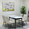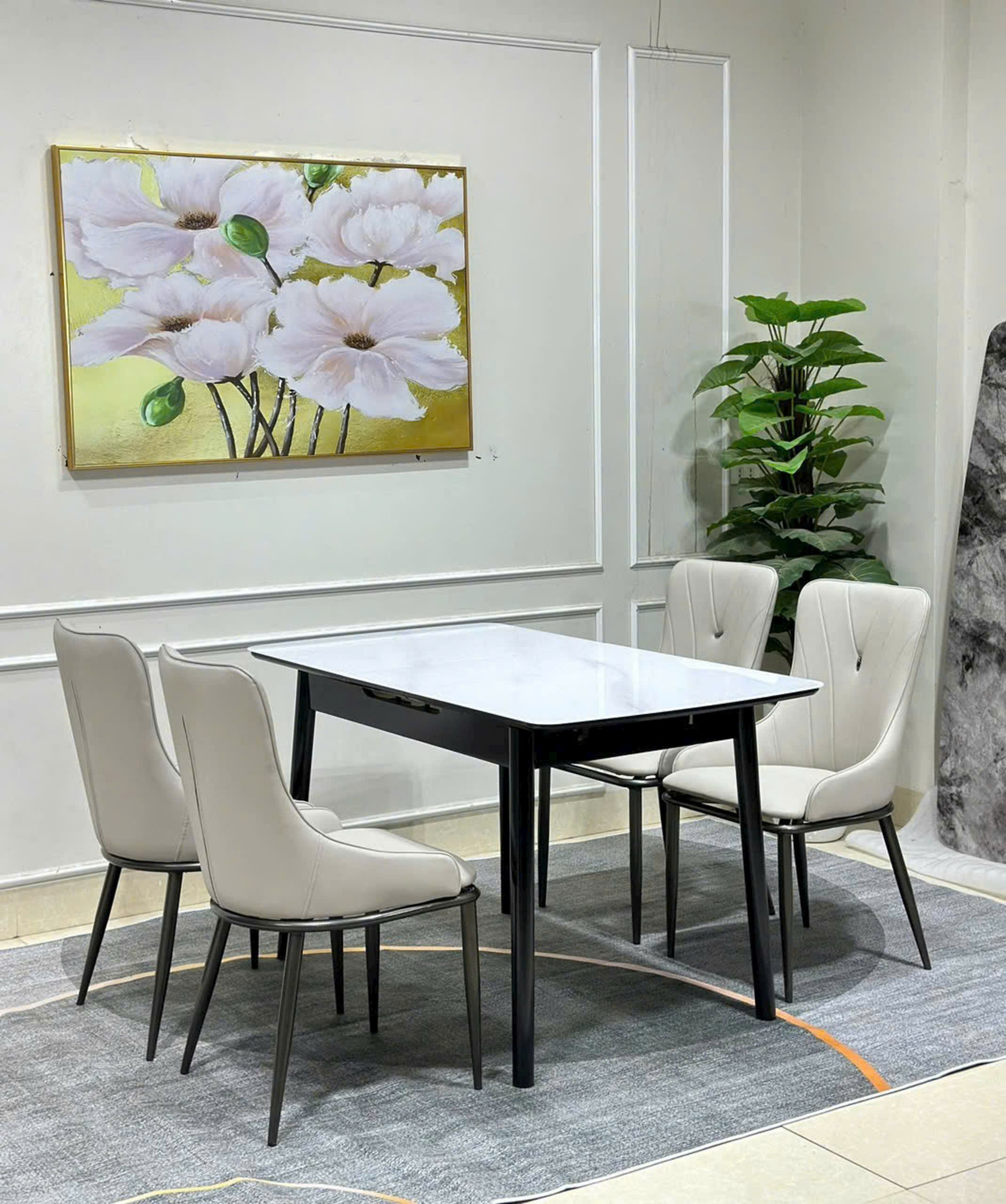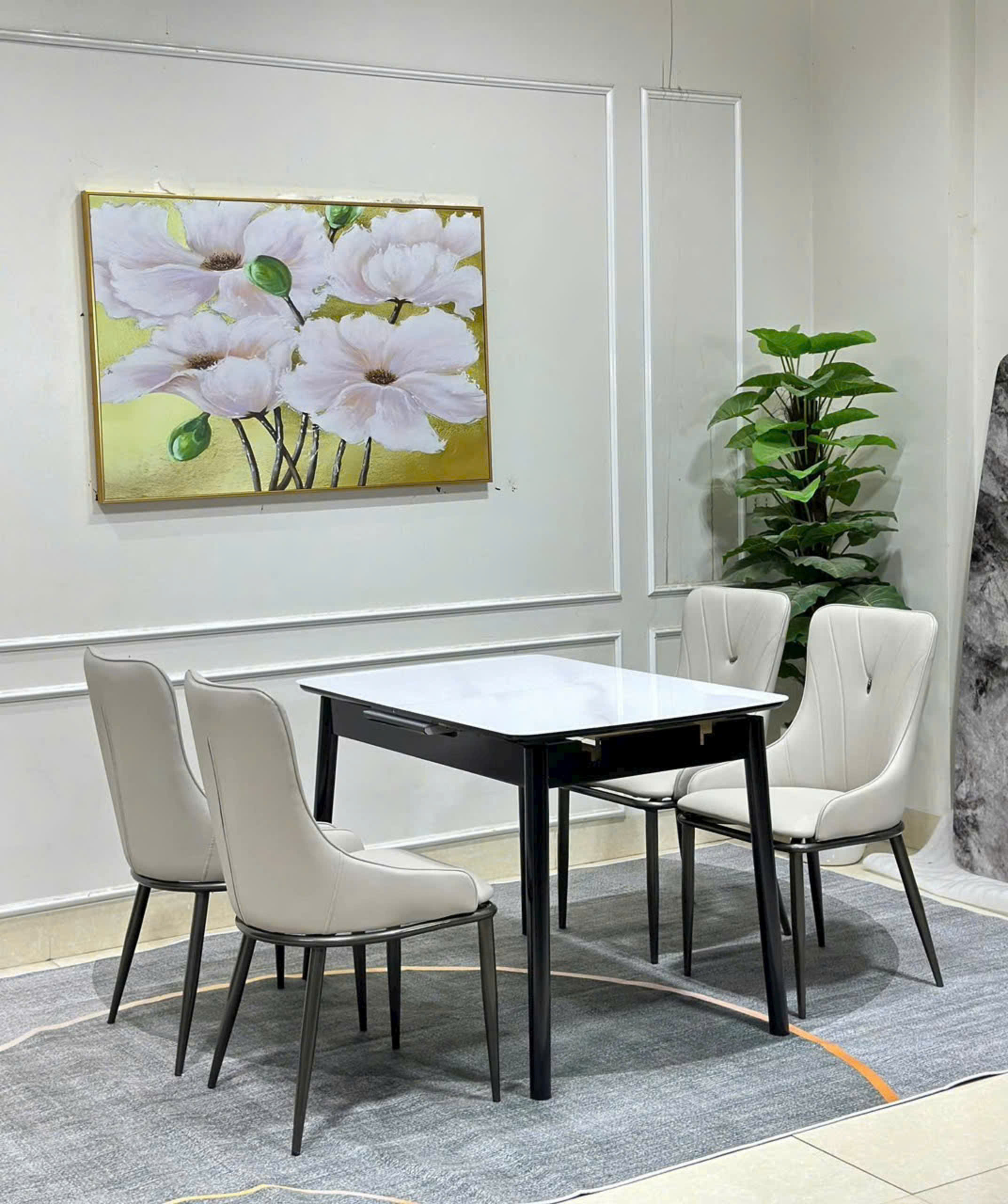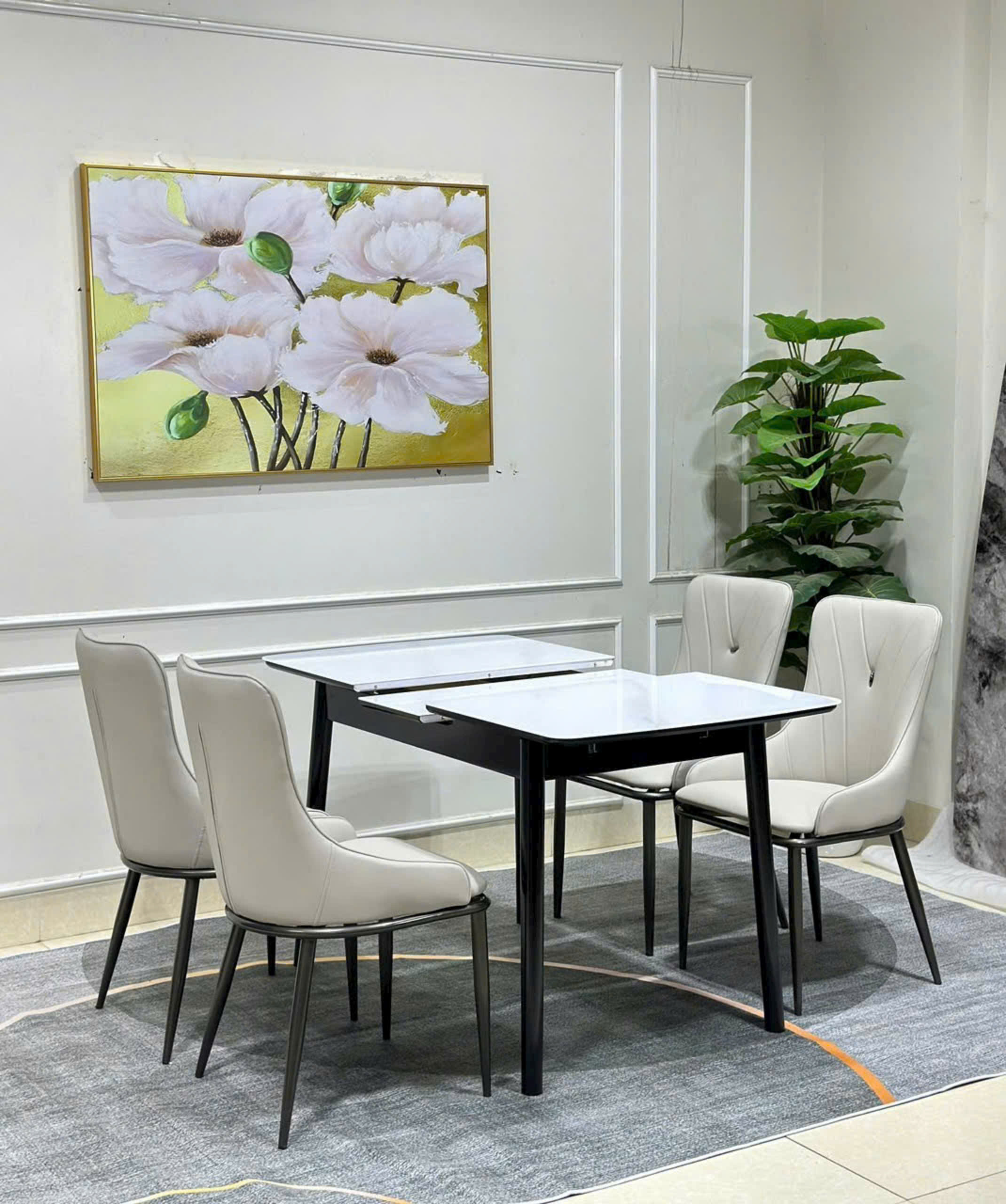 - Vật liệu: Mặt bàn bằng đá Ceramic cao cấp, chân bằng thép sơn tĩnh điện. Ghế được bọc nệm vải da cao cấp và chân thép sơn tĩnh điện.