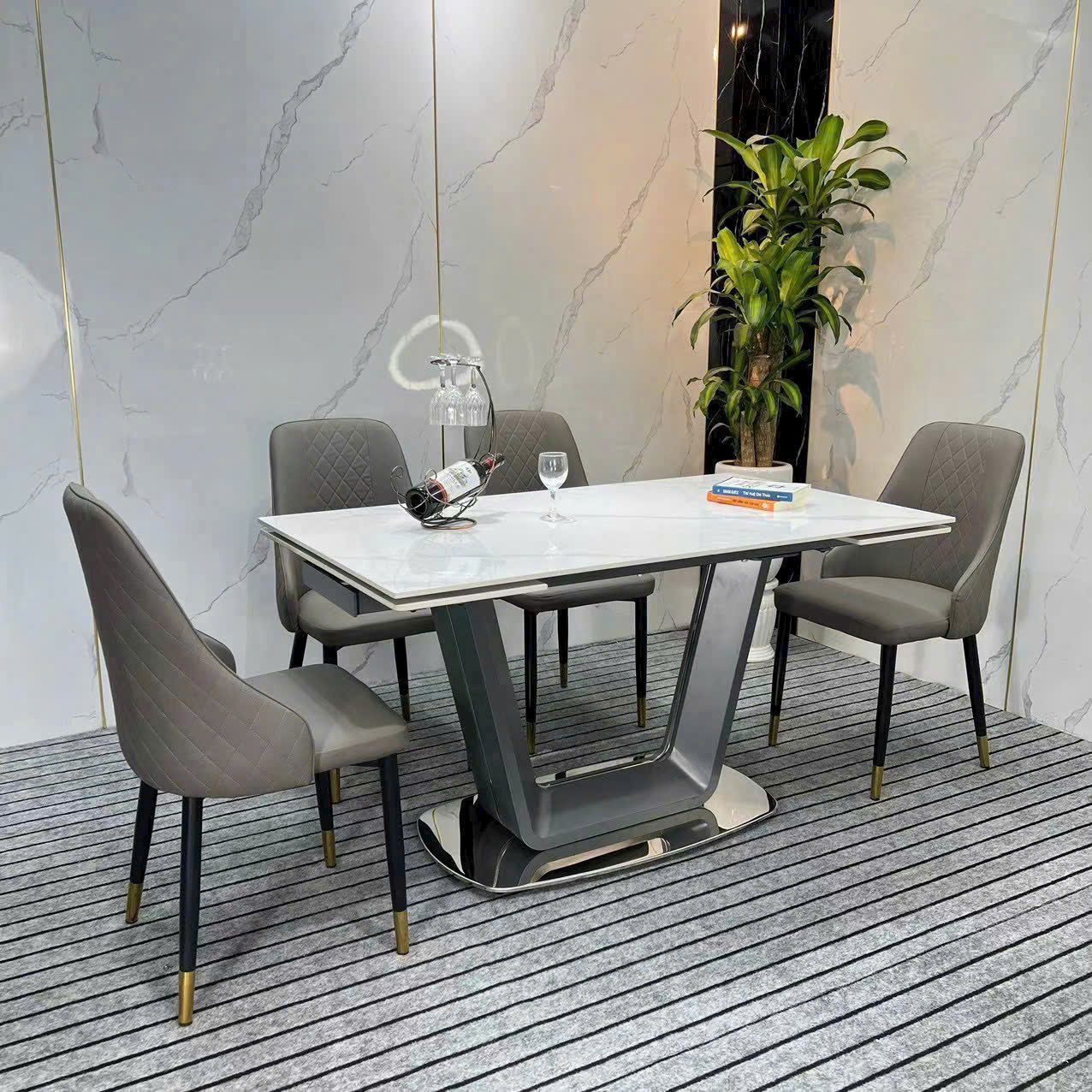 - Vật liệu: Mặt bàn bằng đá Ceramic cao cấp, chân inox mạ titan . Ghế được bọc nệm da cao cấp và chân thép sơn tĩnh điện, nhiều màu.
