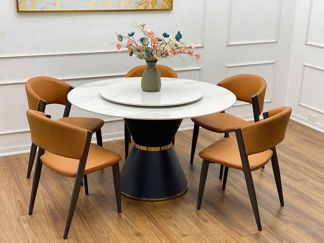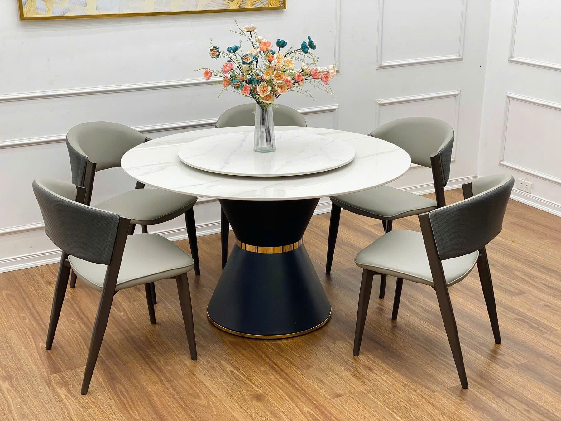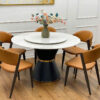Với mặt bàn đá tròn trắng tinh khôi kết hợp chân trụ đen sang trọng, sản phẩm không chỉ là nơi dùng bữa mà còn là điểm nhấn thẩm mỹ cho phòng ăn.
