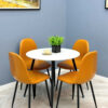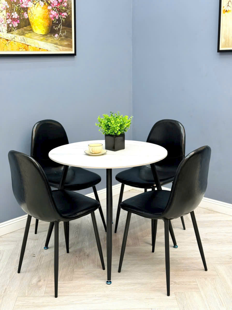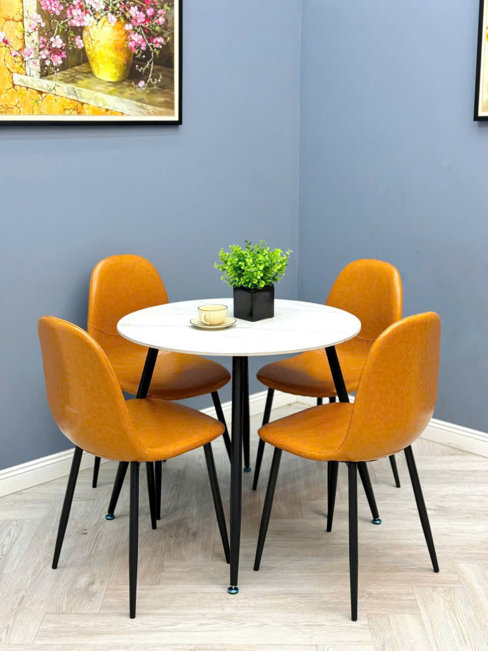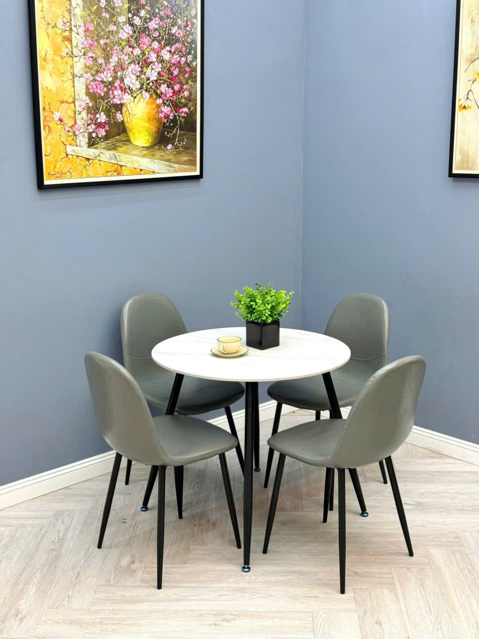 - Vật liệu: Mặt bàn bằng đá Ceramic cao cấp, chân bằng thép sơn tĩnh điện. Ghế được bọc nệm vải da cao cấp và chân thép sơn tĩnh điện.