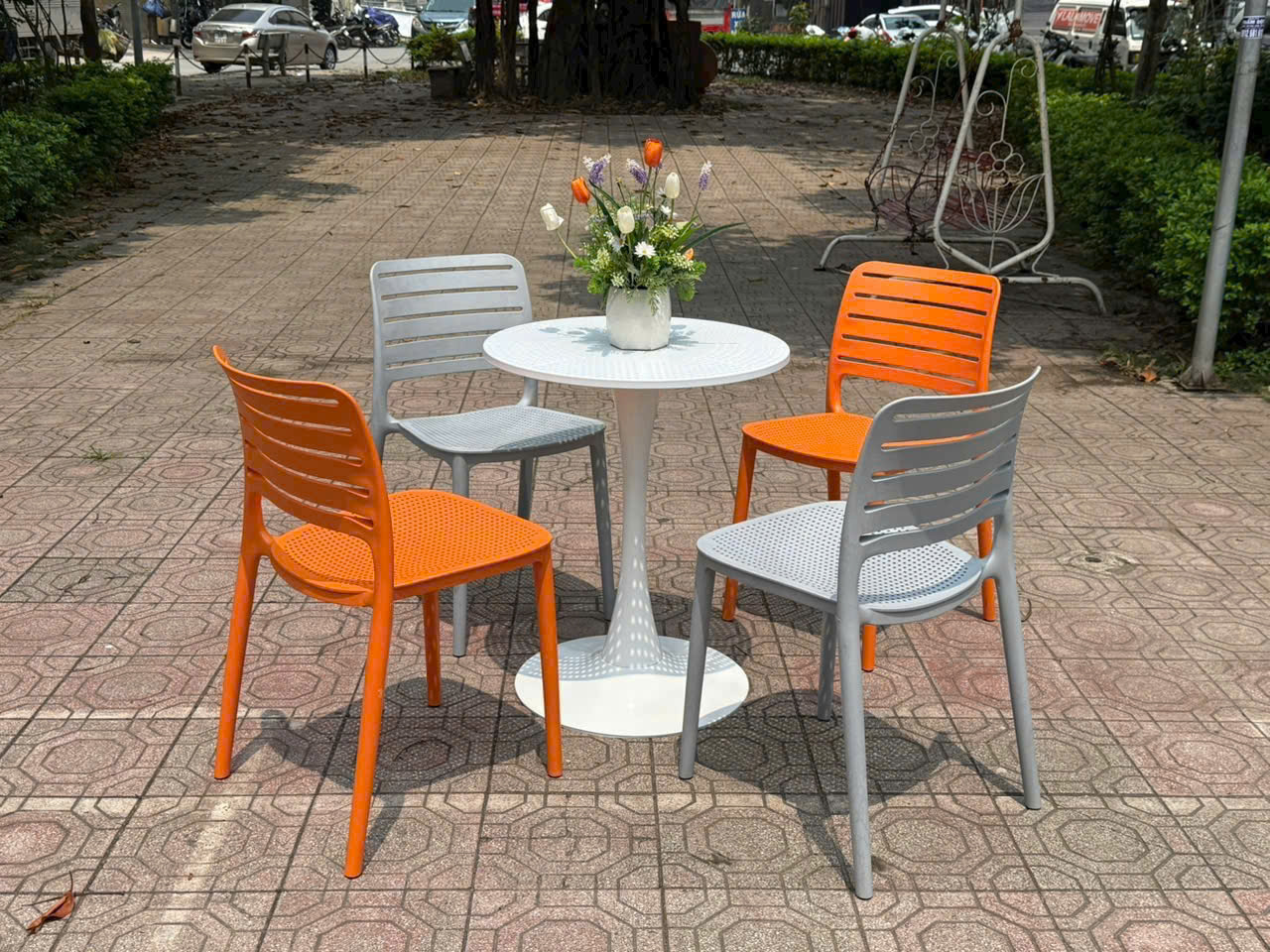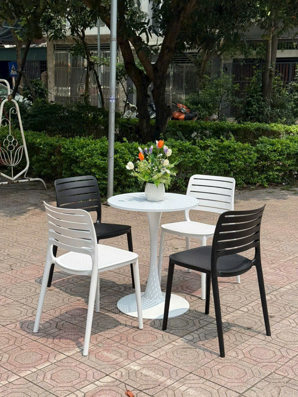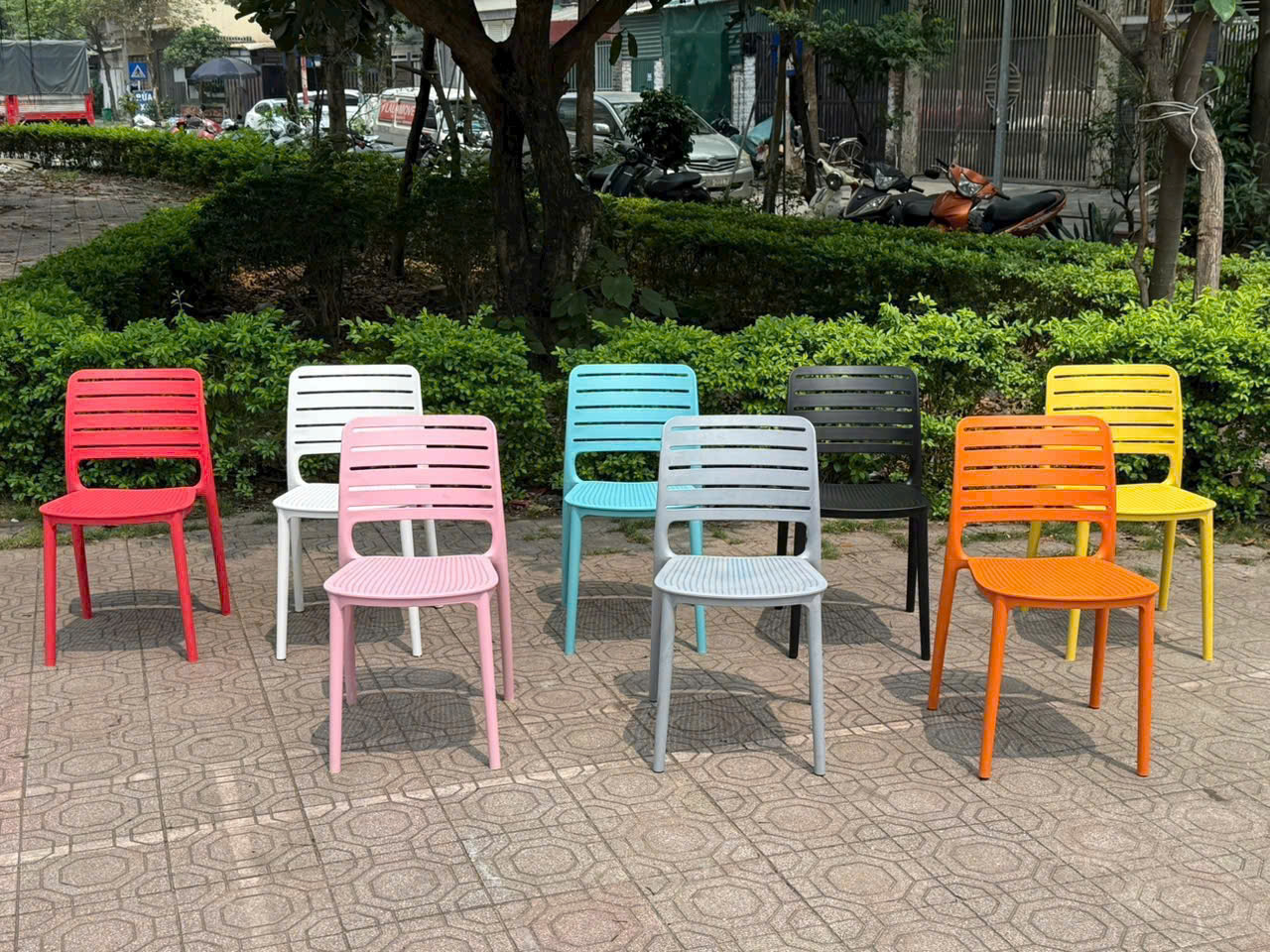 - Chất liệu ghế: Mặt nhựa đúc, chân nhựa.