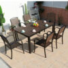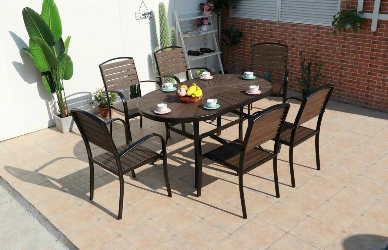 - Chất liệu bàn : Khung nhôm đúc, mặt bàn nan Polywood giả gỗ.