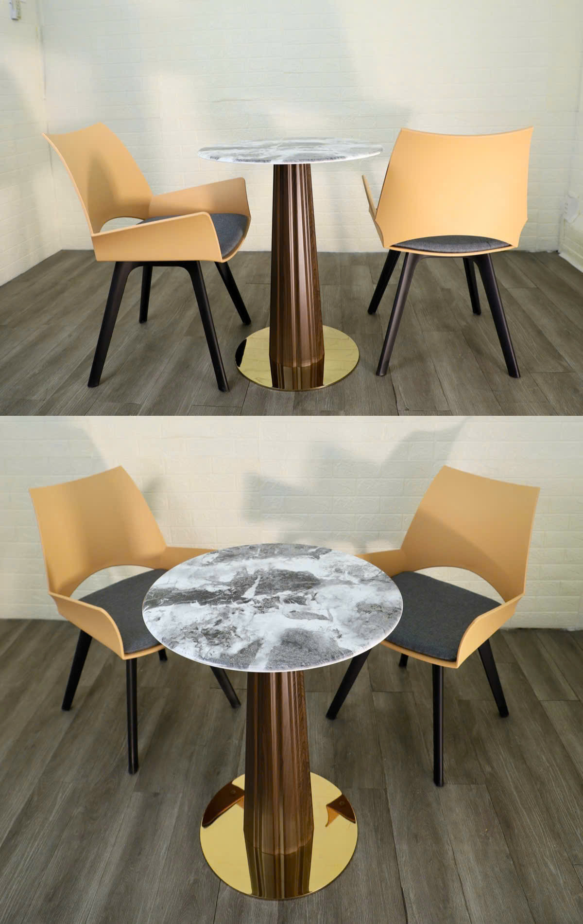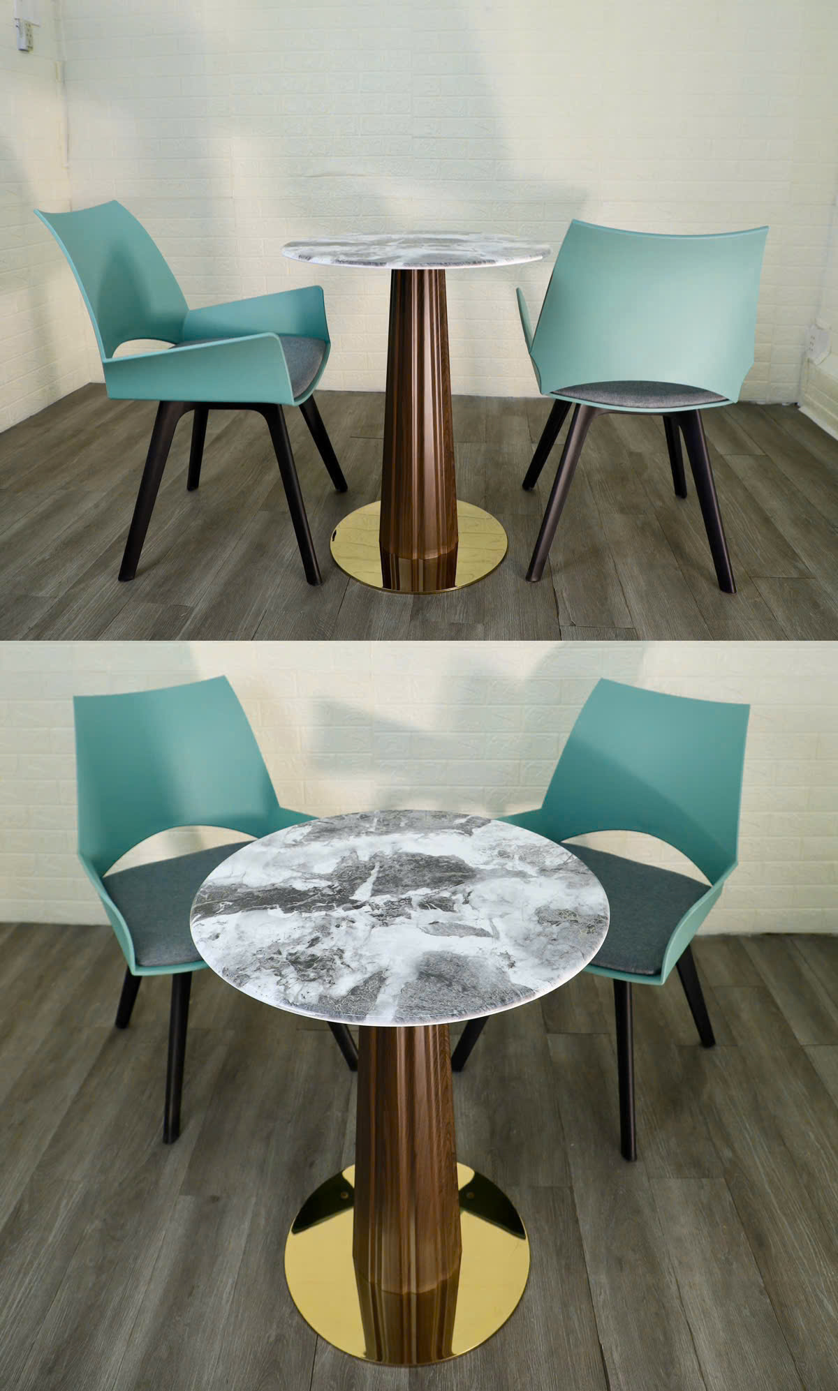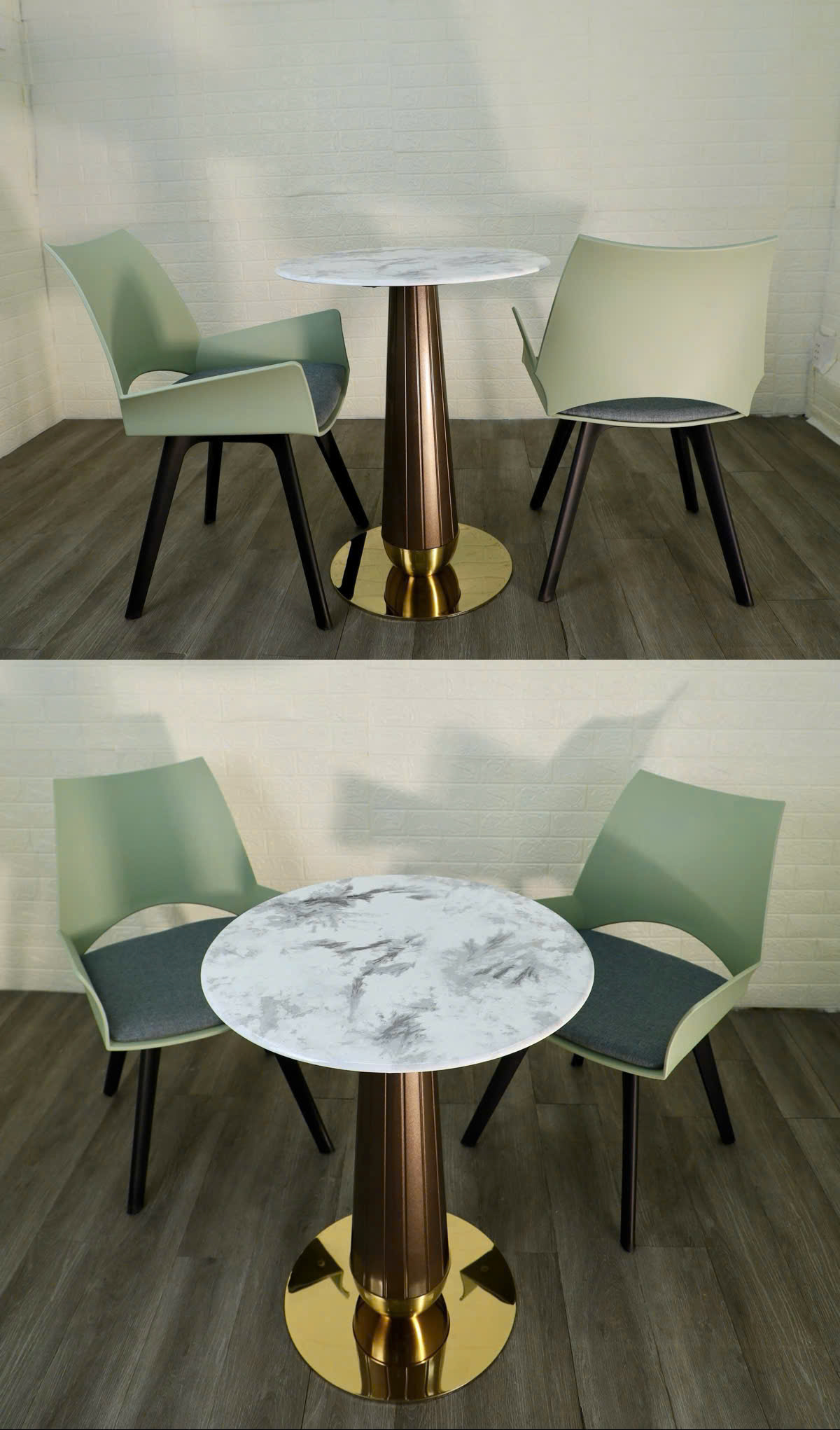 Chất liệu giả đá marble trắng vân xám, bề mặt bóng mịn dễ vệ sinh.