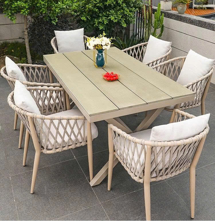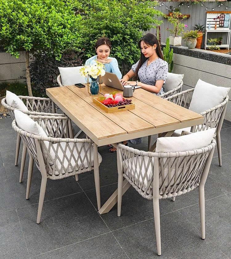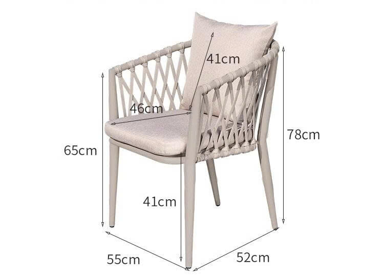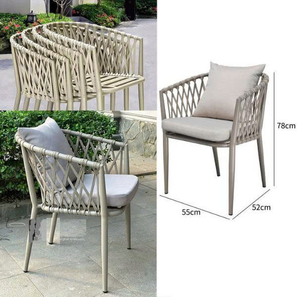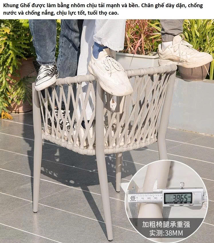 Chất liệu: Khung ghế nhôm đúc. Đan dây dù. Đệm ngồi bọc vải.