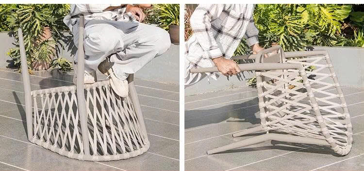 - Đan Dây Dù: Ghế được đan bằng dây dù chất lượng cao, mang lại độ đàn hồi và độ bền vượt trội. Dây dù không chỉ có khả năng chống chịu thời tiết mà còn tạo ra một bề mặt ngồi êm ái, thoáng khí, giúp người ngồi cảm thấy thoải mái hơn trong những ngày nắng nóng.