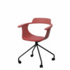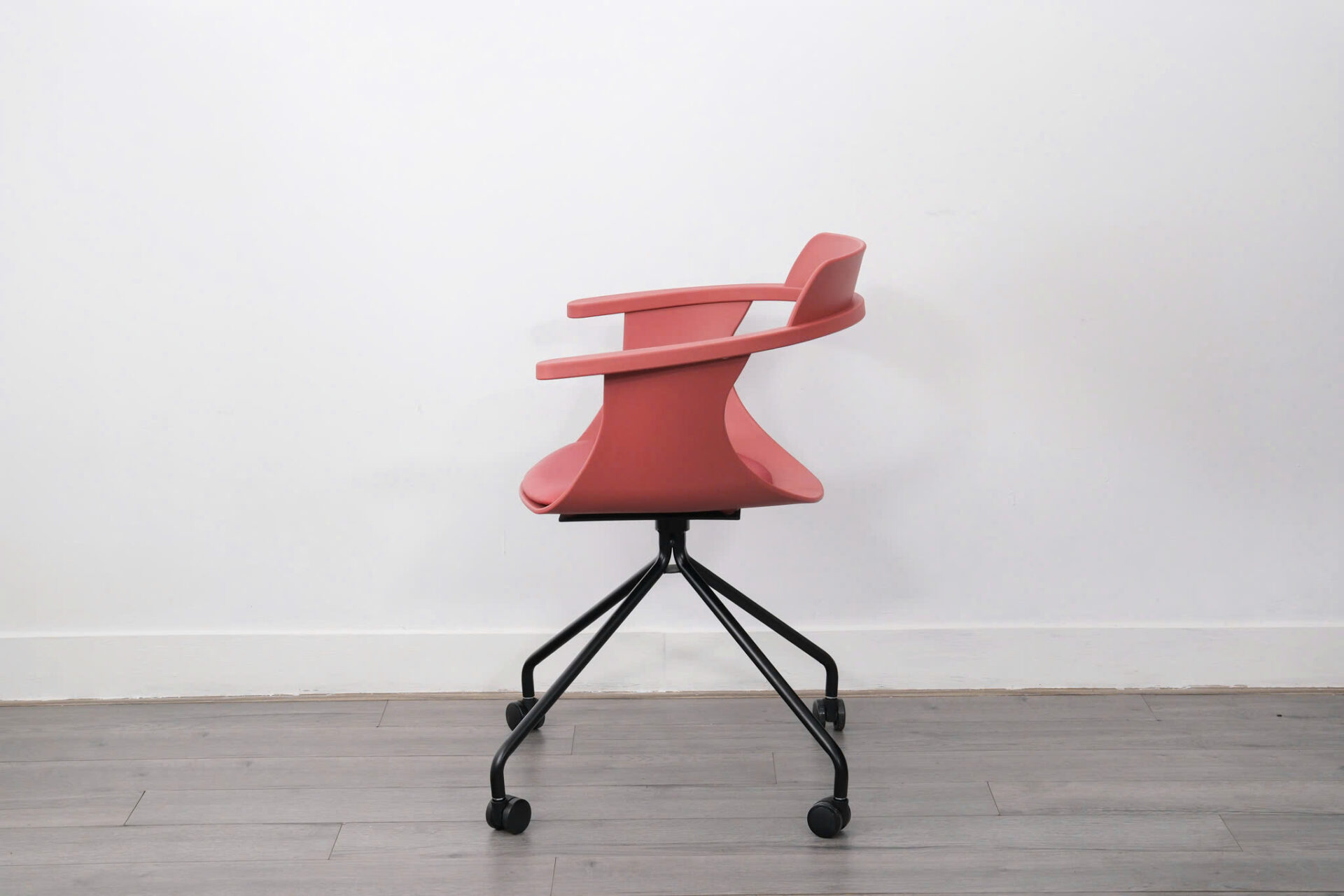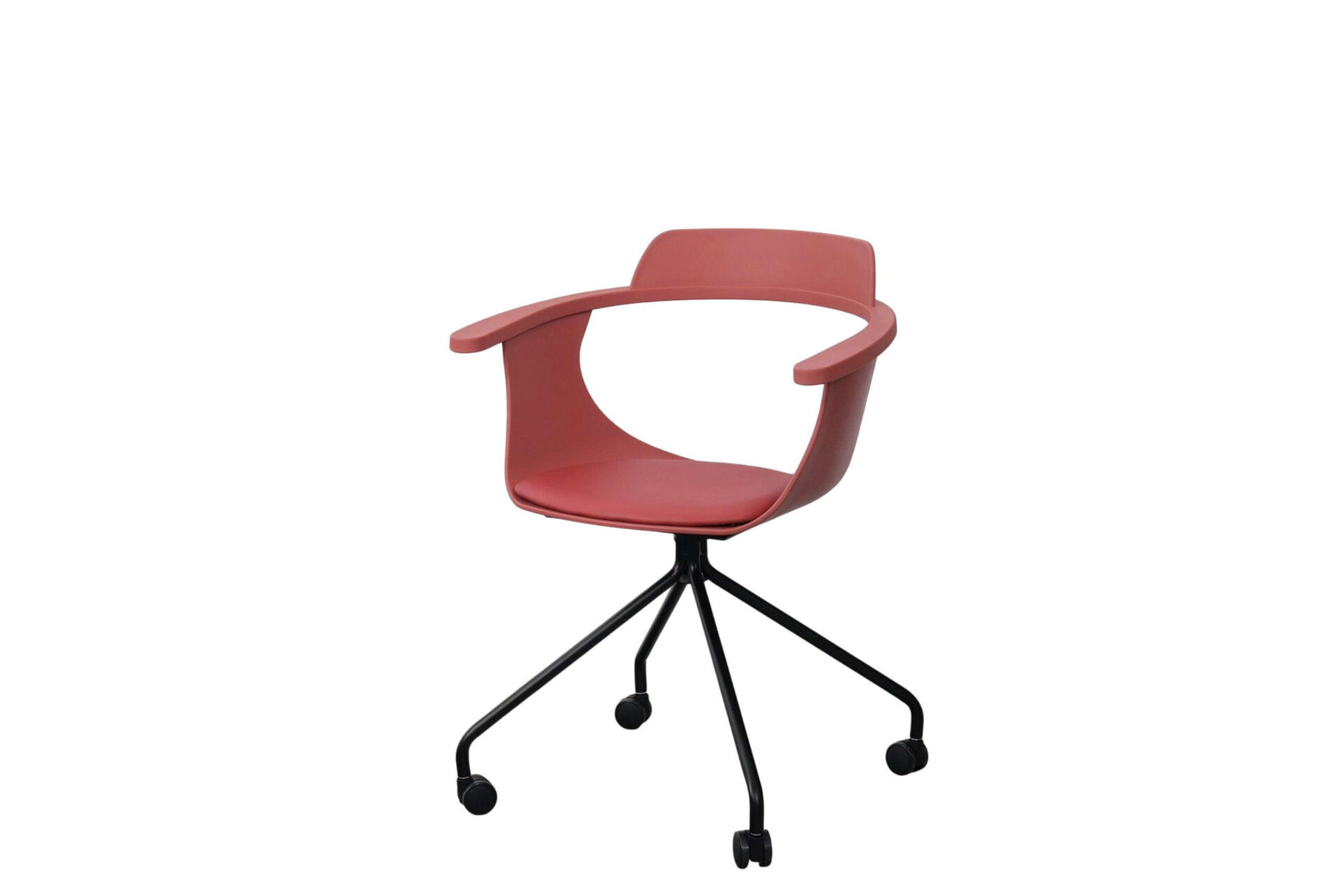 Ghế được thiết kế với phần lưng tựa và tay vịn liền khối, tạo cảm giác liền mạch và sang trọng. Tông màu đỏ hồng pastel mang lại sự tươi mới, phù hợp với những không gian làm việc sáng tạo, trẻ trung hoặc các văn phòng hướng đến phong cách hiện đại.