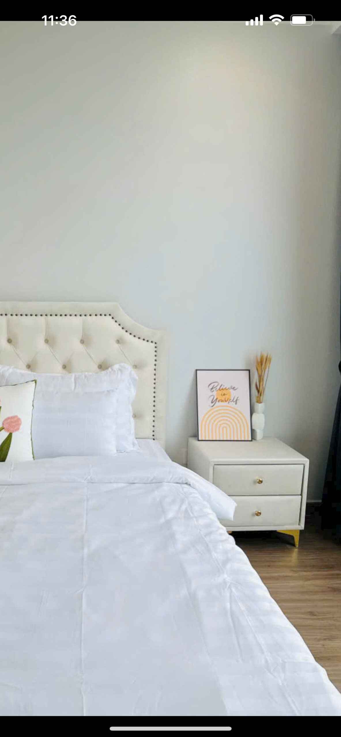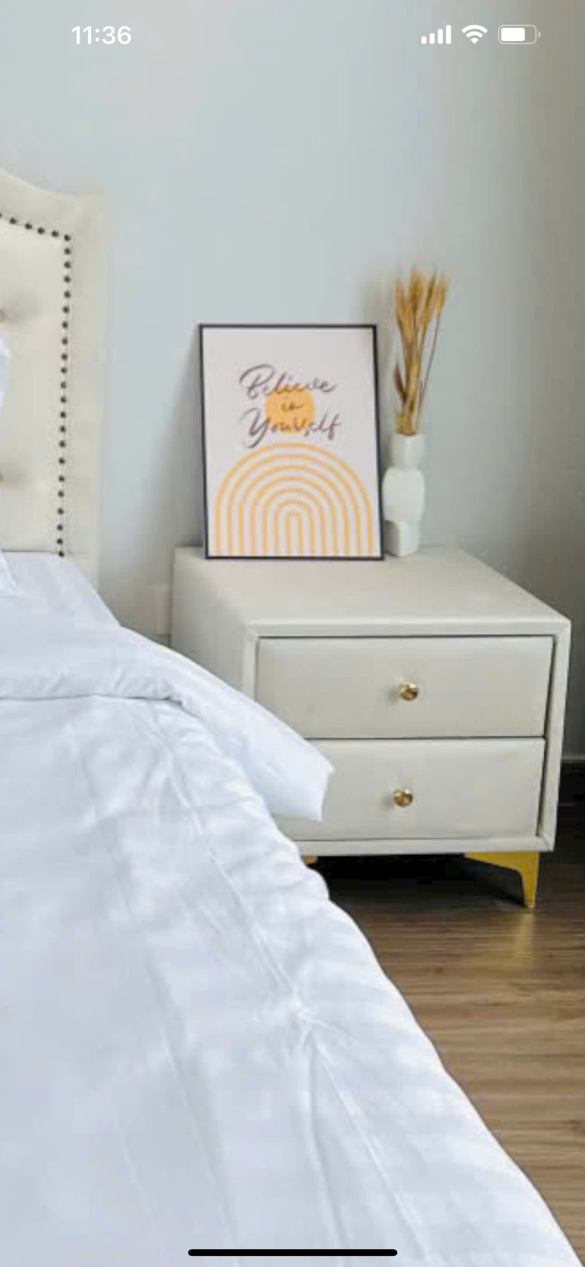 Chiếc kệ tab đầu giường là giải pháp tối ưu cho những căn phòng không có nhiều không gian. Hãy bố trí các ngăn kéo hợp lý và một vài vật dụng trên mặt bàn như dụng cụ trang điểm, gương…để làm bàn trang điểm.